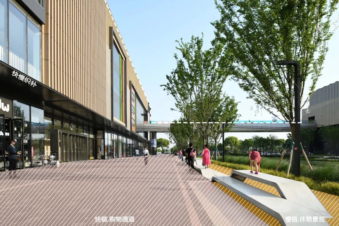 水岸轴小剧场 缤纷聚场—贯穿场地中心的河道及其保护绿地是商业项目中稀有的设计条件。我们希望设计充分尊重自然生态回应廊道空间,把多个小巧灵活的功能空间如“台阶聚场”、“线性聚场”及“波浪聚场”插入滨河绿地,吸引人们亲近水岸,漫步于绿色之中。这些小型功能空间既拉接了商业外延硬质空间和水岸生境,也丰富了两岸长界面的空间体验和活动使用。