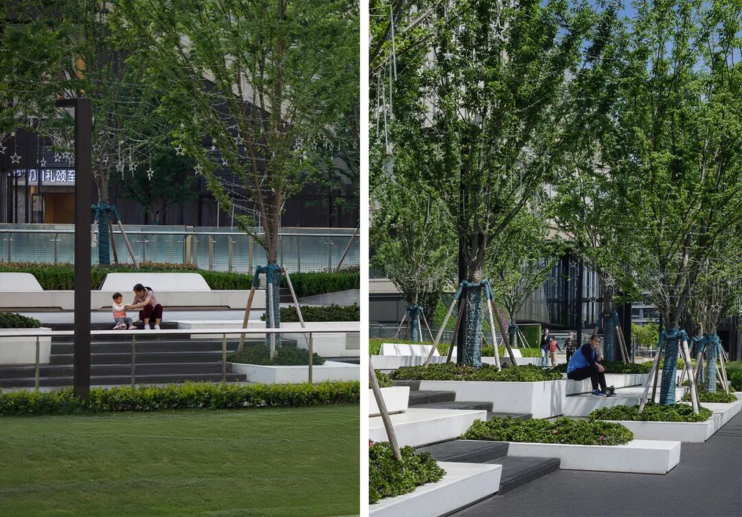 滨水台阶自然的把亲水驳岸和商业广场联系起来,为商业活动提供了另外一个不同气质的活动空间。平日也成为社区居民非常喜爱的滨水空间。