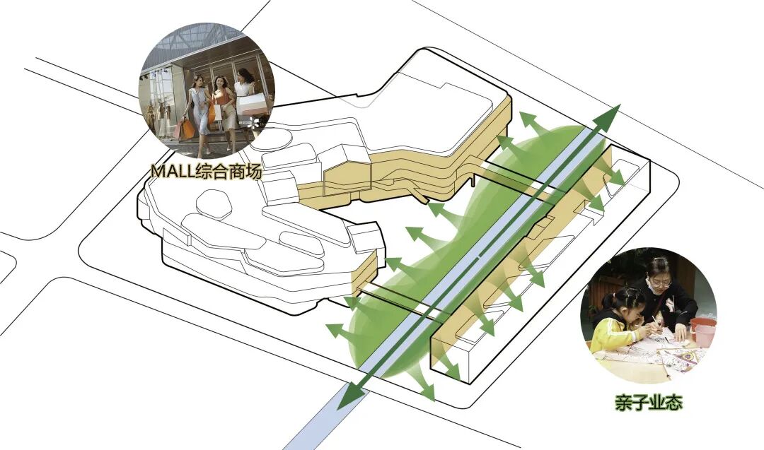 都市新剧场主义:基于我们的观察和研究,商业景观的空间宗旨与新兴剧场的不谋而合:满足流线之下,人群在场地中正式和非正式的聚集观看以及互动参与愈发被重视。承载着商业自身运营需求和社区休闲文化活动的商业景观,既需要像大剧场般的中心活动广场,引发人们围观聚集;也需要小剧场似的灵活多功能空间,鼓励人们社交、玩耍和休憩。