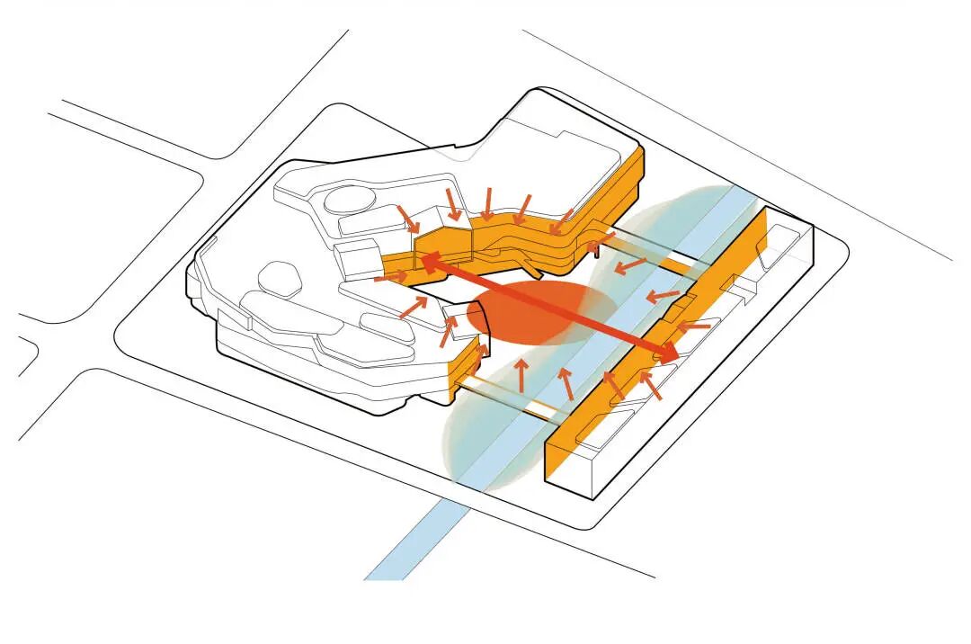 结合东岸的玻璃内廊,我们将连桥景观化处理,形成了空中U型剧场。U型环保式构图可以最大化中心水景广场的视觉吸引力,也是空中鸟瞰整个河道和新区的热力打卡点。