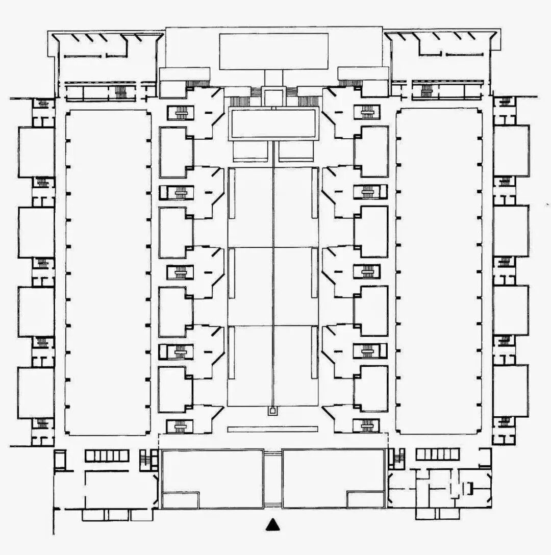 康认为平面是一个由房间组成的社会,即这些房间应该是相互沟通、相互交流的关系。而后区分空间层级,创造了“被服务”和“服务”空间,被服务空间供人使用,而服务空间则供管道和设备使用(这种空间划分还影响到了立面上)。