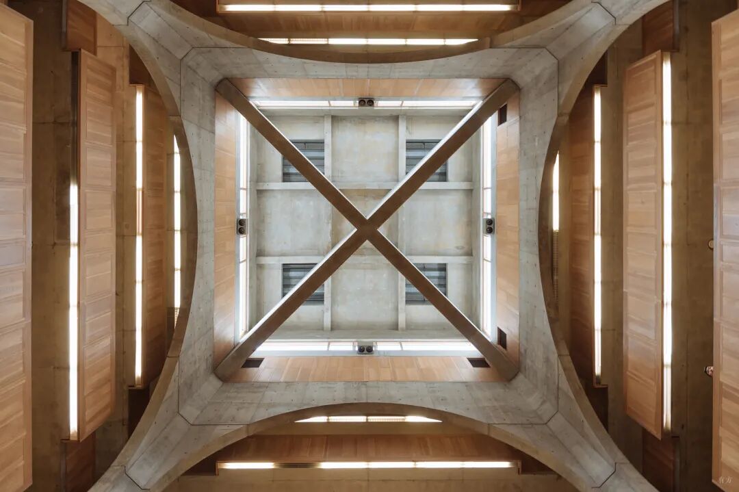 顶上的横梁支撑屋顶,同时也反射屋顶下窗户所射入的阳光