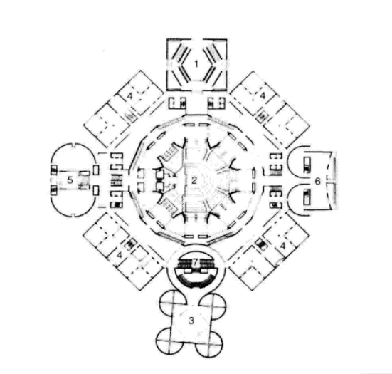 对于康而言,机构并不是那些负面的现实组织,而是其背后的欲望——比如说:学校之中学习的欲望,群体之中,人的聚集表现出来的社群中的欲望……因此,建筑不只是抽象的形式,而是需要一个具体的服务机构:房子为了居住,学校为了学习,等等这些明确功能目的。