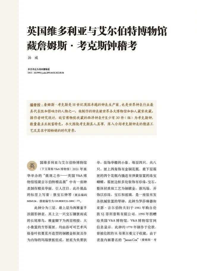 ▶ 詹姆斯·考克斯是18世纪英国卓越的钟表生产商, 也是世界钟表行业最具代表性和影响力的人物之一。他制作的钟表被世界各大博物馆和私人藏家收藏。据作者研究统计,故宫博物院收藏的西洋钟表中至少有30件(组)为考克斯钟,数量最多且极富特色。本文围绕考克斯其人其事,深入介绍考克斯钟表的精湛工艺及其在中国畅销的时代背景。