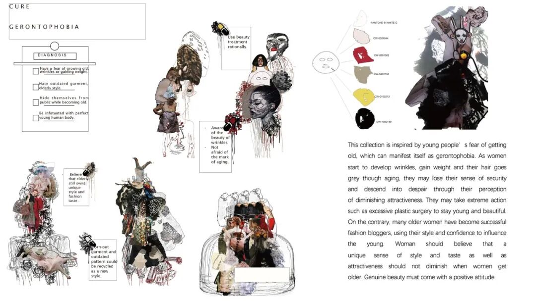 在“REDRESS 设计大赛” 时尚系列中,高青紫应用了升级再造和重新构造这两种设计技巧,改造了纺织色板、已损坏纺织品和二手衣服。其设计灵应源于年轻人对老龄化的恐惧,并希望表现出具时尚感且永恒的风格。