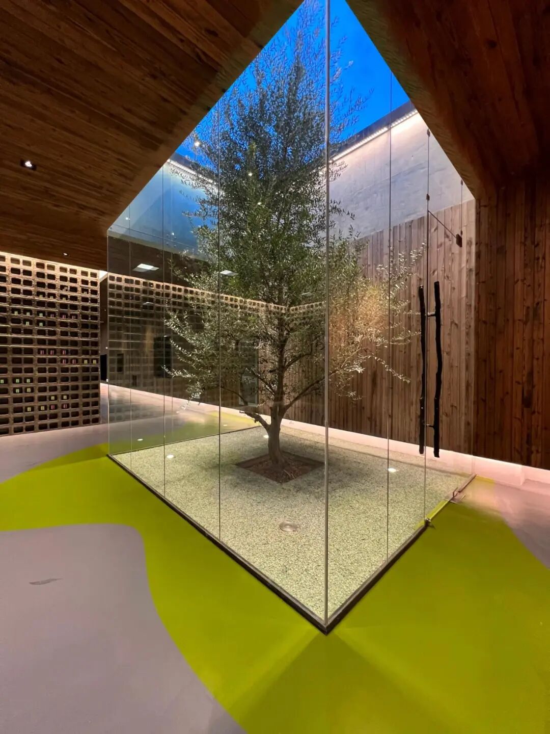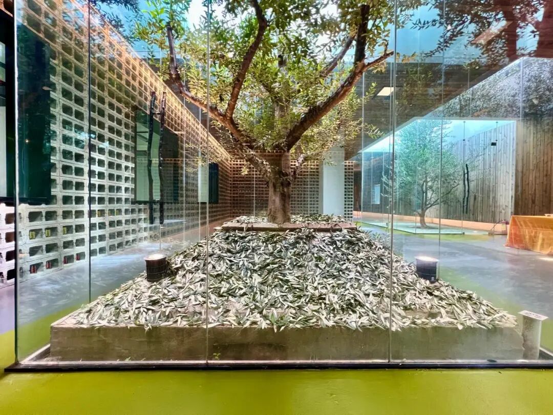展览空间的灵魂是三个围合橄榄树的玻璃盒子。橄榄树玻璃盒子延伸出来的不规则绿色环氧树脂地面好比流动无形的橄榄油滴,从橄榄树上流到有形的生产车间,象征生长的力量和能量的流动。在不同的季节和阳光下,展示不同的姿态和色彩,将人与自然如此紧密连接。盒子之间是展示品鉴区,以及由当地的建筑材料方形空心砖打造的橄榄展示墙。太阳升起落下,天光闪耀暗淡,树影婆娑,微微摆动的橄榄树叶影子洒落在刻有橄榄树叶的水泥地面上。影随光动,静中有动,动中有静,有机重叠着无机,有形中蕴含着无形,室内室外模糊了边界。