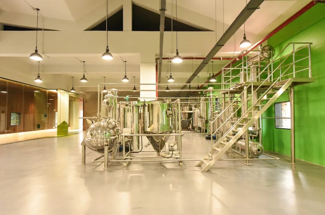 室内空间根据生产流程分成三段,研发,生产,装瓶。展览空间的参观走道平行于生产流线。步入展览空间,迎面而来的是洒满阳光的橄榄树盒子。左边望出窗外是雪山白云美不胜收的自然景观,右边隔着玻璃是现代化生产车间里橄榄从果子到榨油的全流程, 沿着精心设计规划的动线,体验不同空间位置自然光影的流动,同时观摩已延续数十年的榨油工艺。