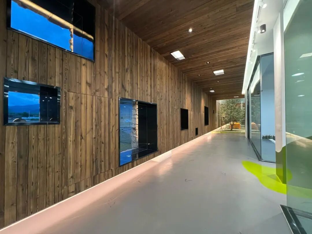 当地纳西民族建筑回收木板建造的饰面墙从东到西贯穿整个空间。地面清水混凝土,印着橄榄叶子作为标识引导客人参观。方形的灯光盒子跟建筑的方形开窗遥相呼应。