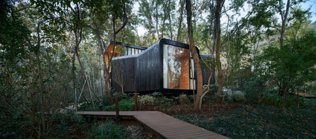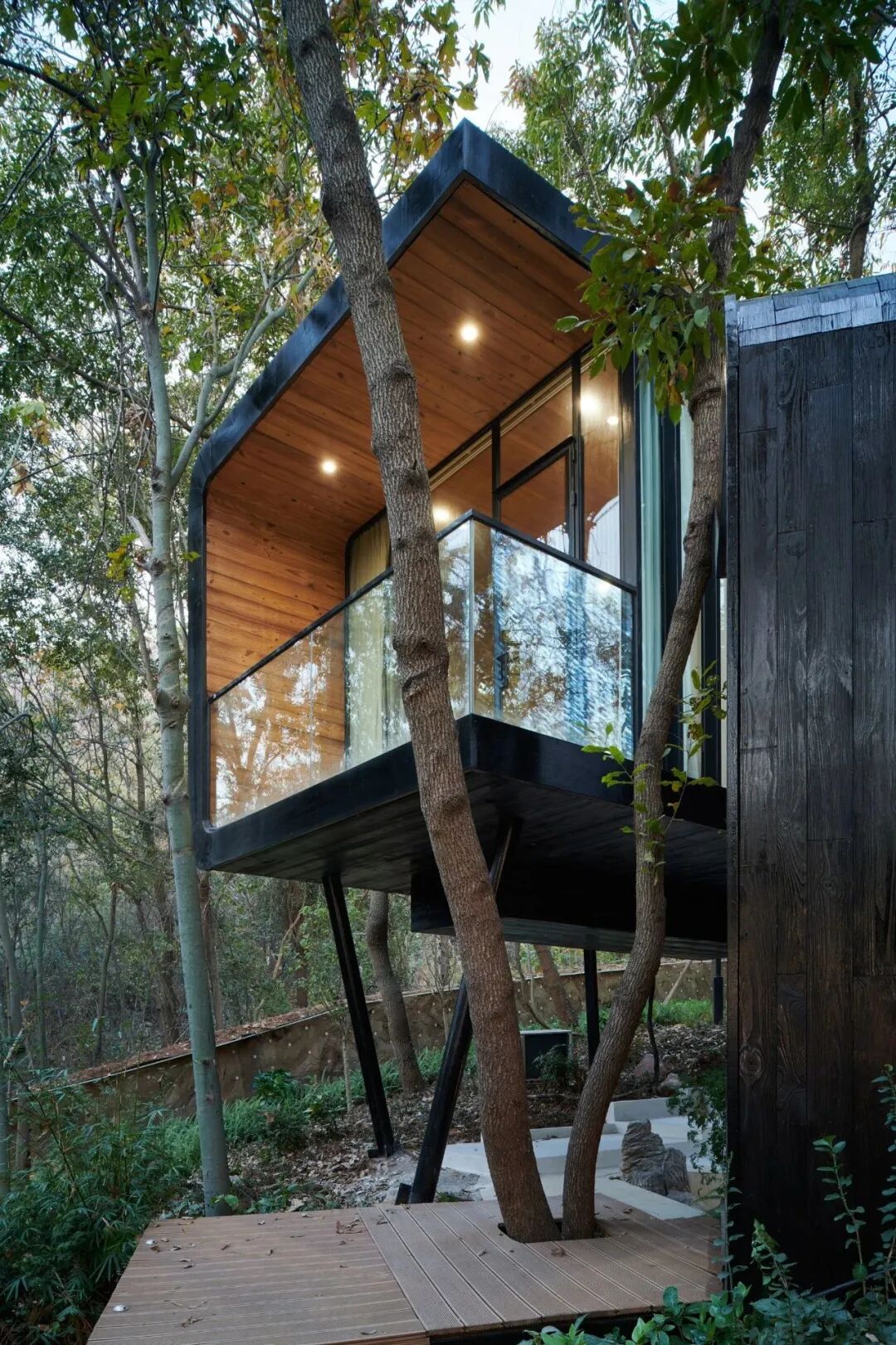 作为室内功能中必要的一部分。四栋小屋造型相似,却用两种不同的材质表达对自然的态度:树林中的两栋小屋使用了炭烧木作为表皮,黑色的立面将小屋隐匿在郁郁葱葱之间;另两栋暴露在石阵之上与树林边缘的小屋,以原木色的质感包裹,缝合自然环境与人工空间的距离。