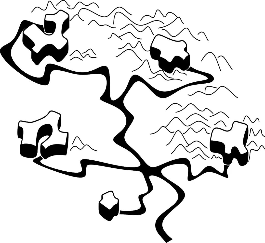另两个小屋与石阵纠缠在一起,平坦的卧石用作建筑的基础,拔地而起的峭壁,撕裂了每个功能空间彼此直接的联系,致使小屋的轮廓如同树枝般遗落在自然之中。