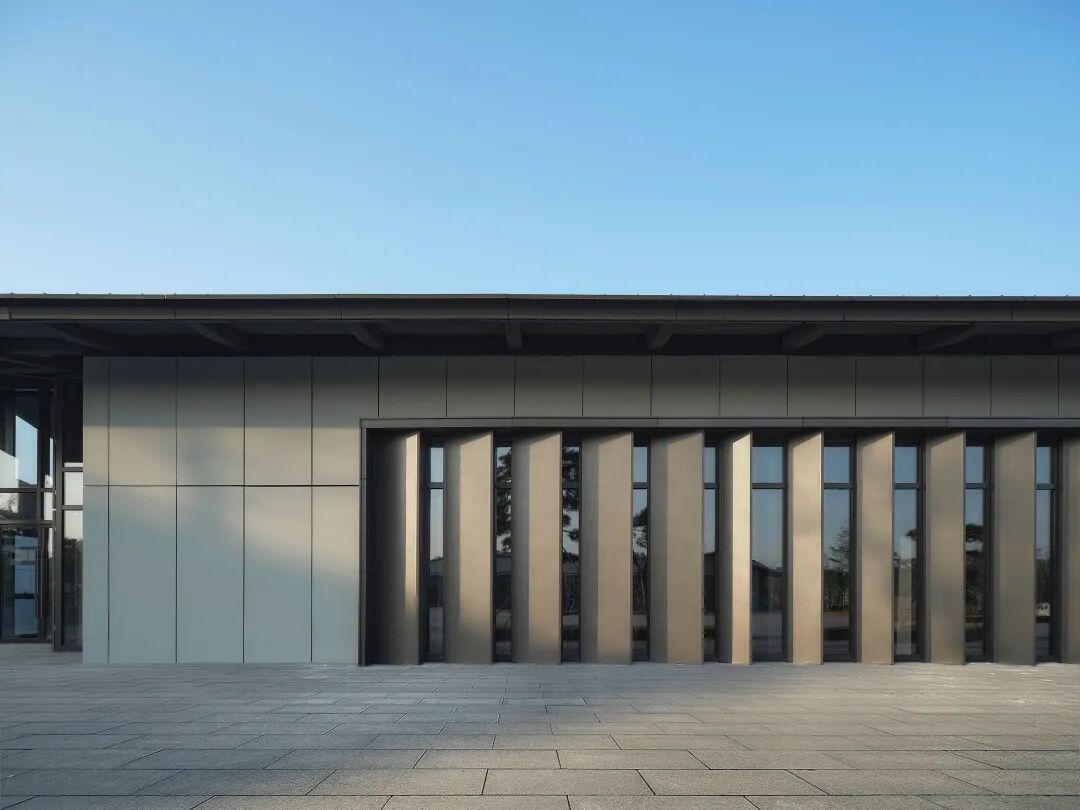 考虑到建筑东西向的阳光照射过于充足,设计使用仿木色的穿孔铝板作为遮挡阳光的一个“屏障”。穿孔遮阳板亦是“补风器”—窗开启扇隐藏于遮阳板内,让立面只暴露”补光器“—采光用的整玻璃。细节设计使纵横交替的线条简炼有力又有一丝灵动的韵律,让建筑立面看上去干练又不失古朴庄重。