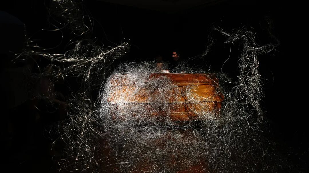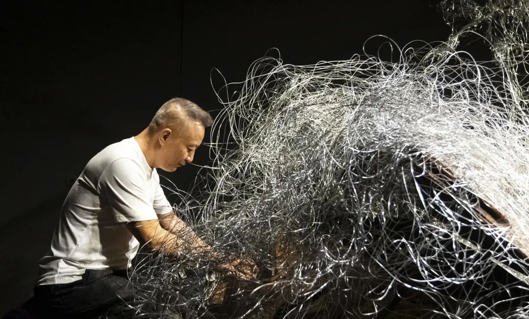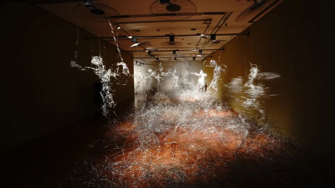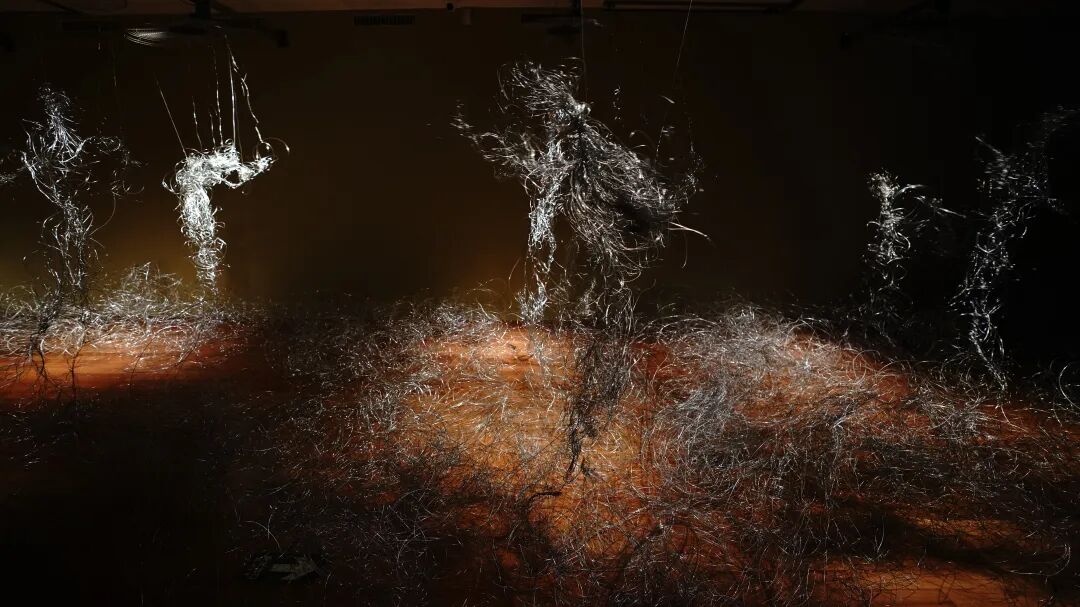 一号厅不停舞动的铁丝人偶,所用的铁丝先是被艺术家在身体上缠绕,再挣脱,而后再用这些铁丝造就了人偶。史金淞以自身为模型做的那些人偶,不仅是对自身的刻画与追问,也是人类主题的镜像观照,也让我们寻求一种答案, 就是“什么是人”,“人在此刻可以做什么”。关于身体的伦理、人的主体性的追 问与反思在此刻是重要问题。密布的铁丝中陈列着一台钢琴,黑色、冰冷、坚硬的钢琴外形线条与弯曲、摇摆、混乱的铁丝、人偶有节奏的舞动与钢琴的无 声一一形成有趣的对比。