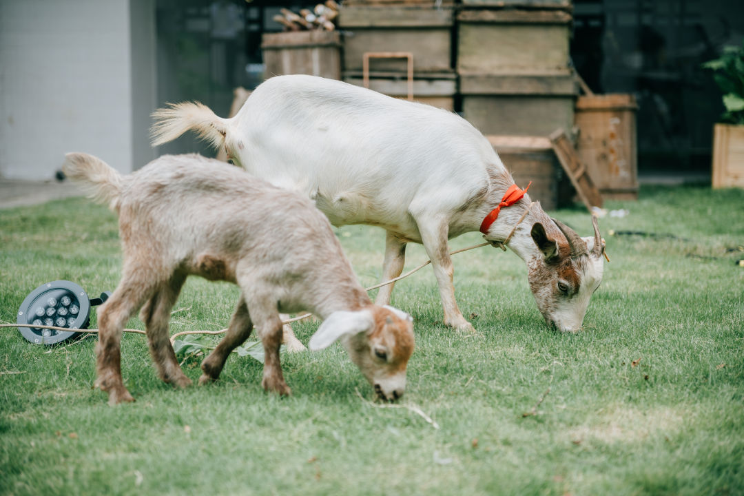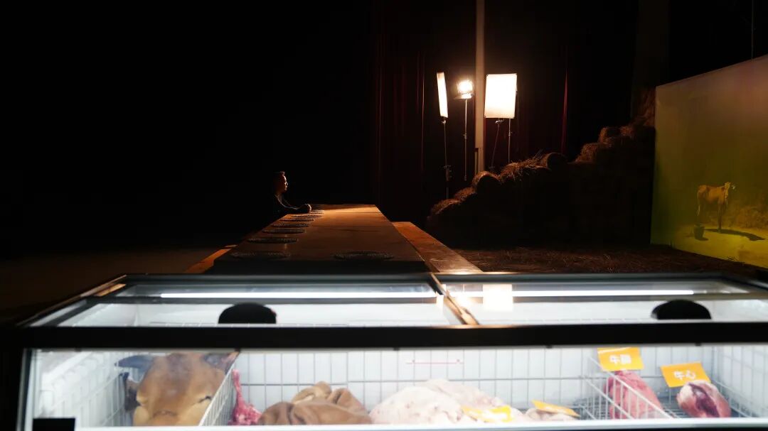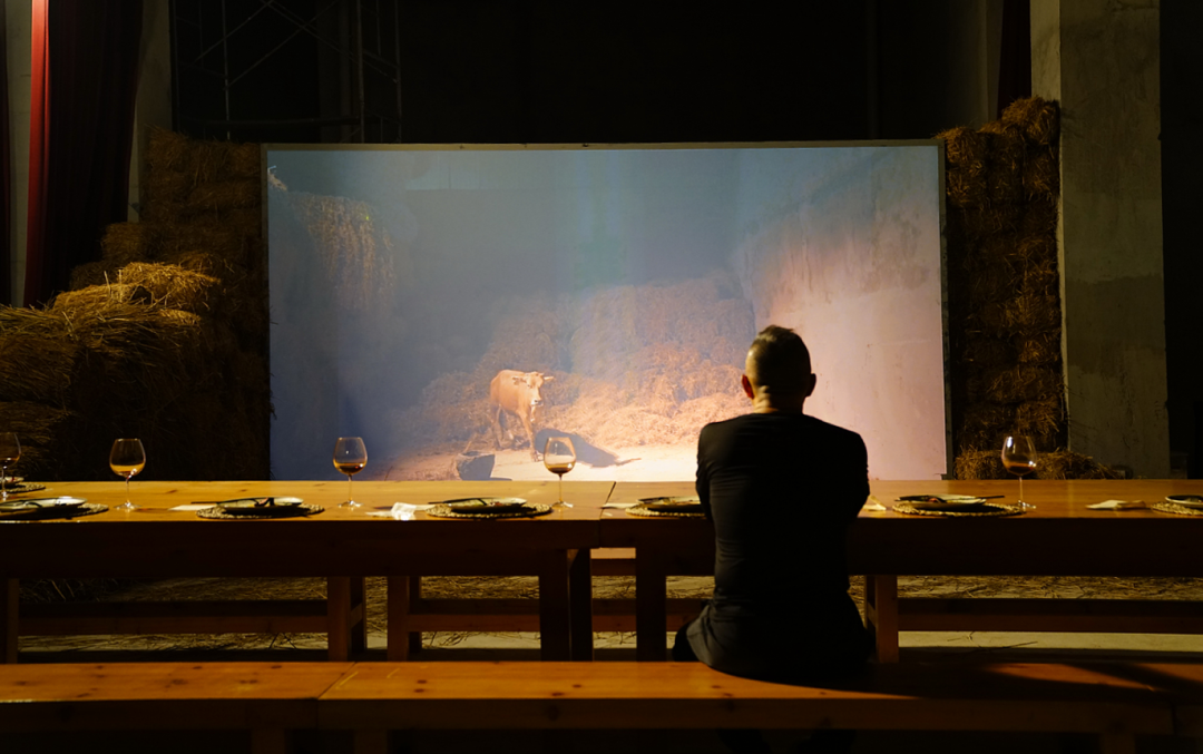 最后一个厅在悬挂红色舞台帷幕的剧场空间里,湖北当地的夷陵牛作为主角登场。展厅里呈现了牛的三种状态:透明冰柜中雪藏着被屠宰肢解的一整头牛。稻草环绕的巨幅屏幕上展现的是一头悠闲淡定的牛在农场牛舍中安然信步。在可以容纳13名食客的长桌上,则是牛的另一种形态:牛排。