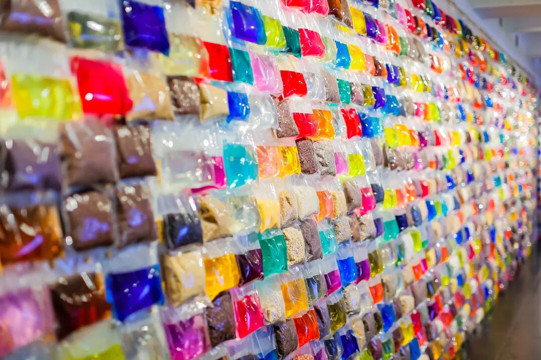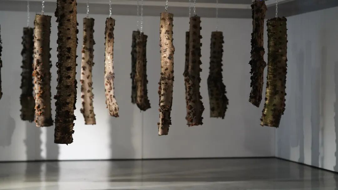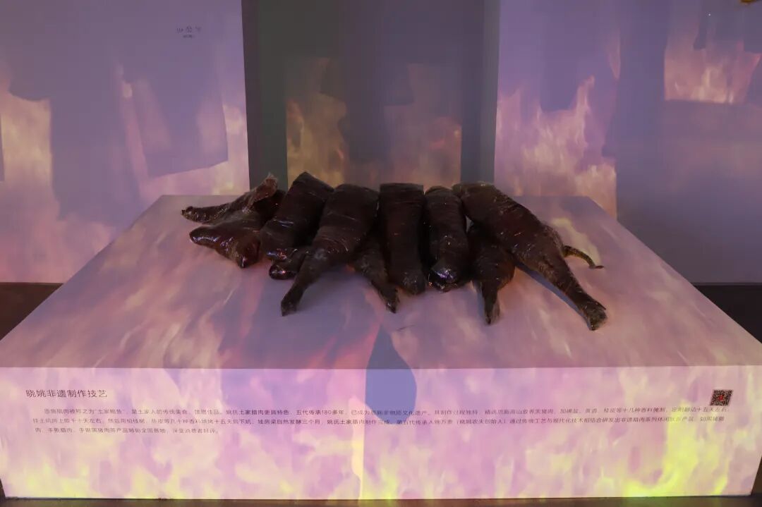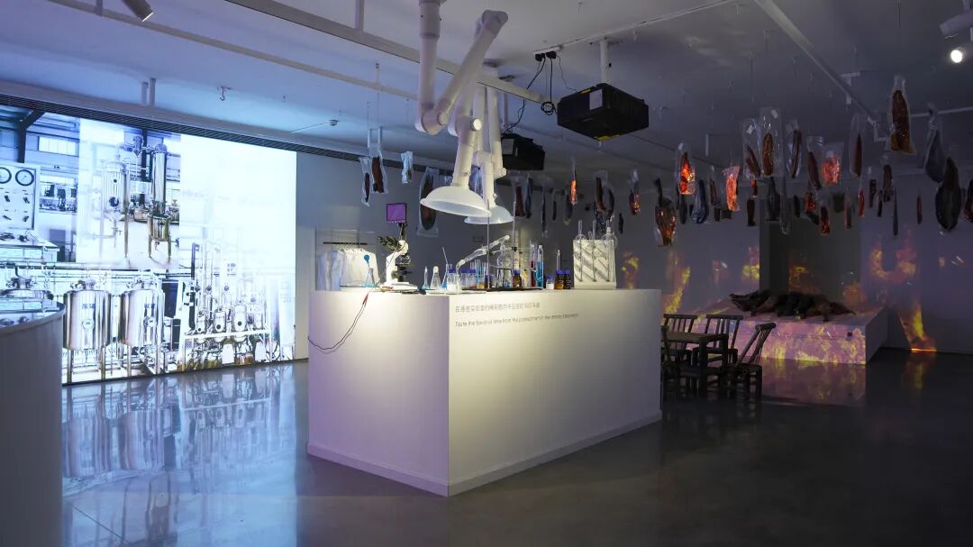 展厅门又由蜂箱堆垒起来的高塔仿佛巴别塔——食物作为一种语言可能搭建巴别塔的最好材料。蜂箱是自然的社会形态,也是天然的剧场。蜂塔下的羊是关于迷途的生命。展厅内被“规训”的稻米是东亚文明的底色,五谷酿造的酒水是酒神精神的升华。厅内的氤氲缭绕的渡船既是鱼米之乡的风光,也是自外于儒家文化的庄子逍遥游精神的外溢。“感官实验室”是科技对味蕾的量化,也是科学在食物进化史上的留痕。腊肉提醒人们,时间是另一种重要的烹饪方式。腌制的辣椒咸菜则是某种地方性格更浓烈、更具色彩的表达。美味真菌的漫长而盛大的生命力,以及神奇的记忆力与感知力则提示着未知世界的广袤。所有材料构成一个“与万物共情,与自然同频”的生命哲学现场。