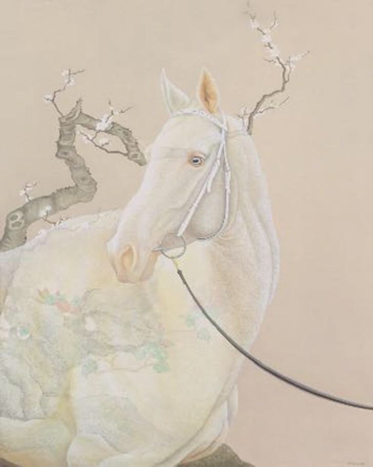 白就是“玉白”,这幅画的名字真是美极了,因为你把玉质感表达出来了。有位诗人曾说艺术的魔力在于“把马骨头里的玉”取出来,传统绘画里还有一个画马名为《夜照白》的作品。你很好地把马的传统透明的画法与油画的质感,把中国艺术特有的“玉质感”表达出来了。而且让花的绚烂重叠在透明的马背与马臀上,真的非常性感,非常梦幻,非常诗意。这种玉质感,一直是让我着迷的地方,也是我在中国艺术界提倡的一个观念,就是要把绘画的质地,尤其是油画,画出一种新的玉质感出来。如同中国玉器的丰富传统,在画布上产生一种透明的玉质感,这个系列是你所自觉的表达