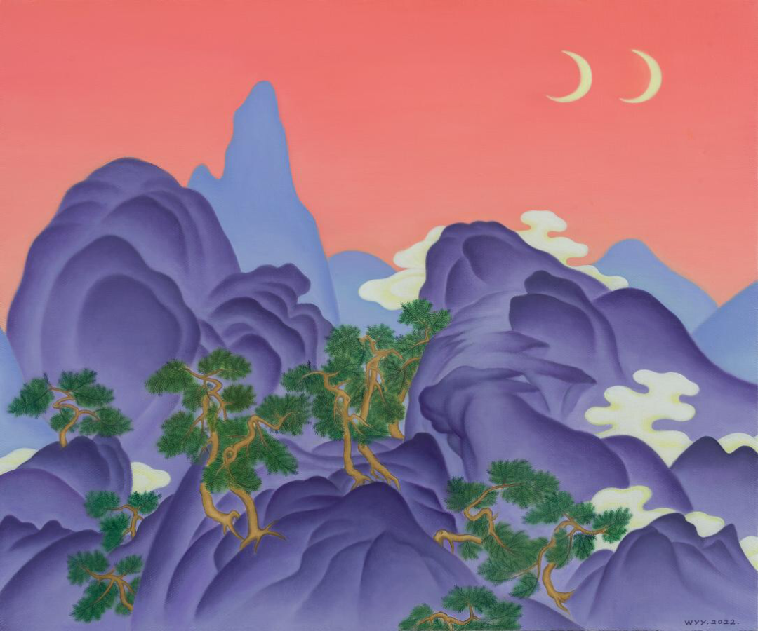对,这一张就叫黄色月亮,背景天空大胆的用了中国妃红色这种颜色是趋于红色和色之间山体用的黛紫和钴蓝两个月亮其实代表的是两个不同世界的对话