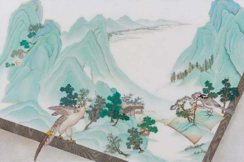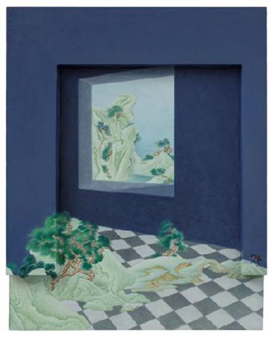 嗯,我觉得你还有好几幅作品是二维平面上对于三维错觉的塑造。比如刚才我们提到过的《青卞雀图》,就是把传统山水画的作品加以变形。你是怎么想到这种变形方式的?并且整个好像是一个画框样的,这种画框感是马格利特式的“画中画”的感觉