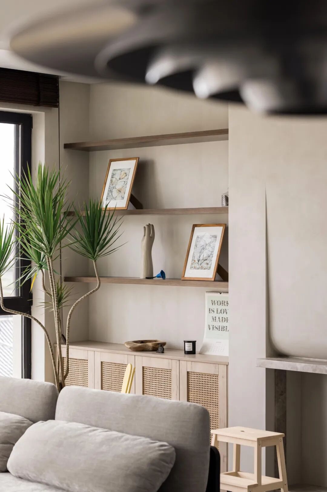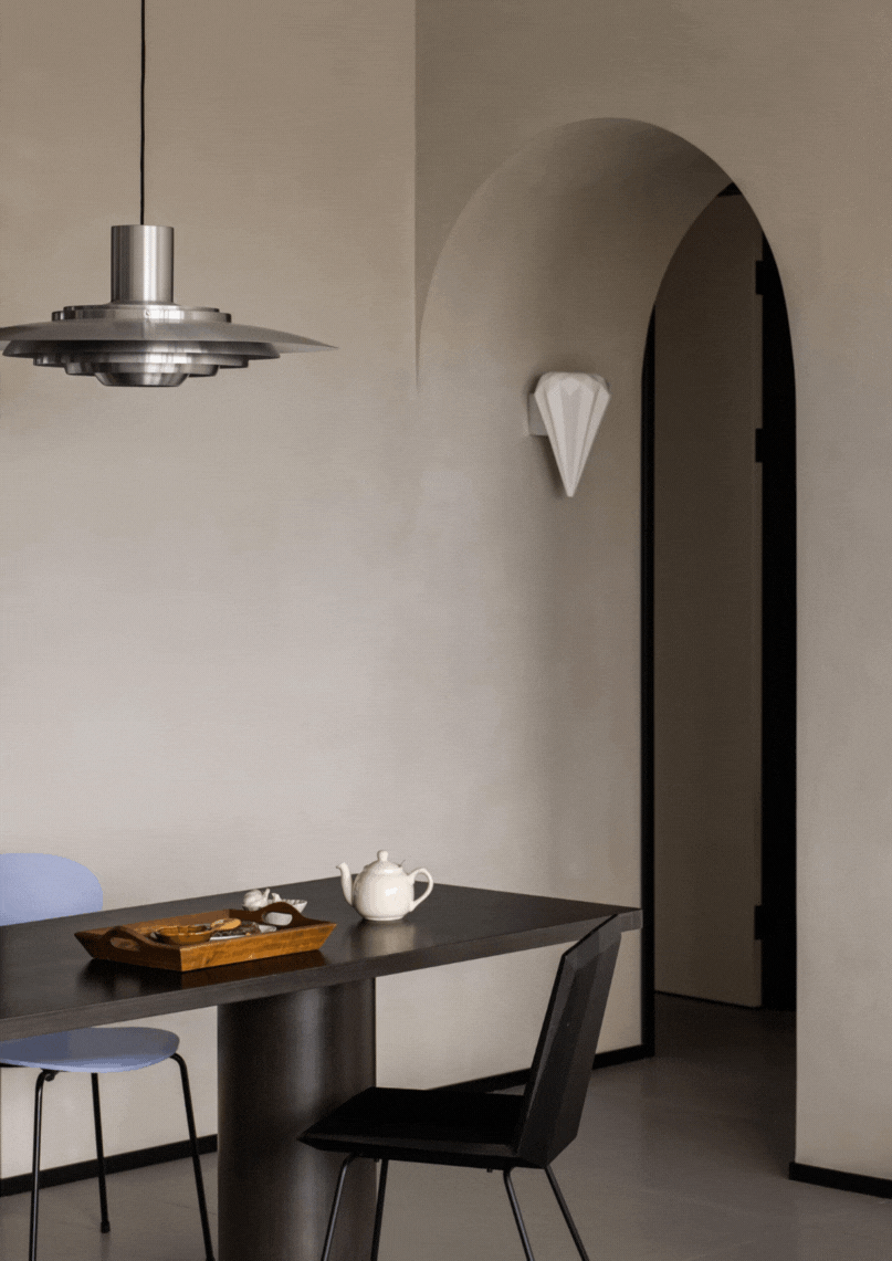 此次新案的屋主是一对80后的夫妻:李先生和Roro女士,以及一只叫做蛋花的“蠢萌”猫猫。他们有着天生的默契,还有数不清的共同爱好。无论是工作、生活、旅行或是宅家,都仿佛有说不完的话题。漫无目的的画张小画或是尝试一些新的食谱(黑暗料理),是令Roro感到很享受的事情,而李先生最享受的则是负责品尝这些「黑暗料理」并给予评价——很棒!房子位于顶层,封顶结构较为特殊,大开间的客厅、优越的层高,是李先生和Roro喜欢的风格。他们拥有了第一个家,一个可以装满所有热爱和经历的属于他们的小家。