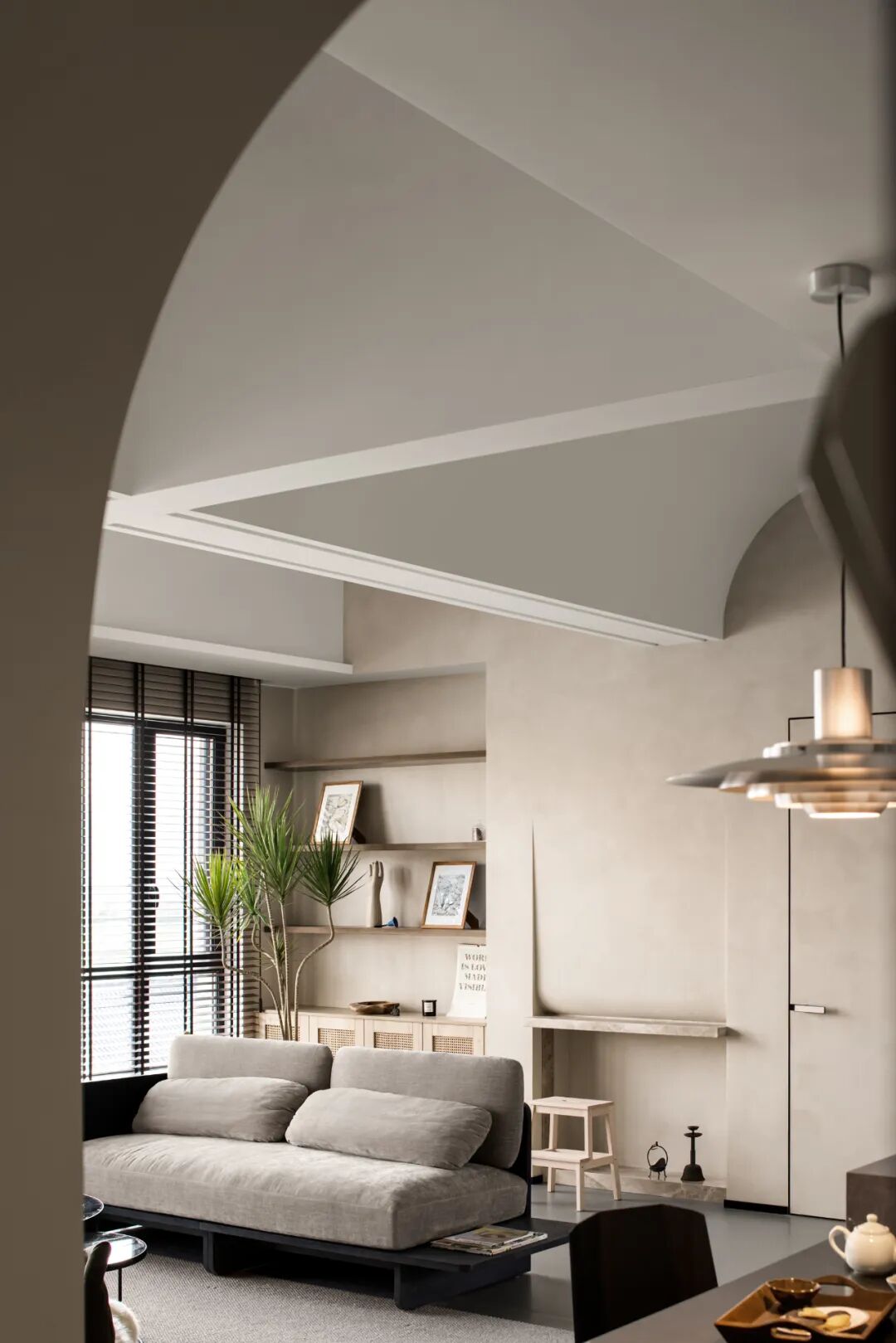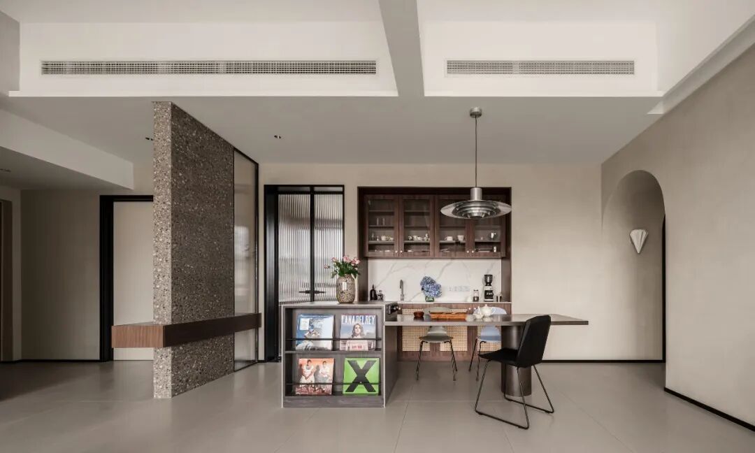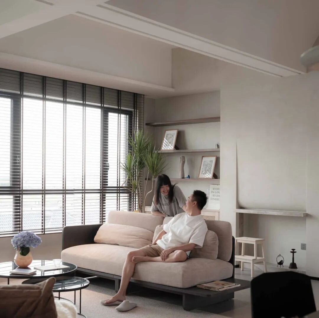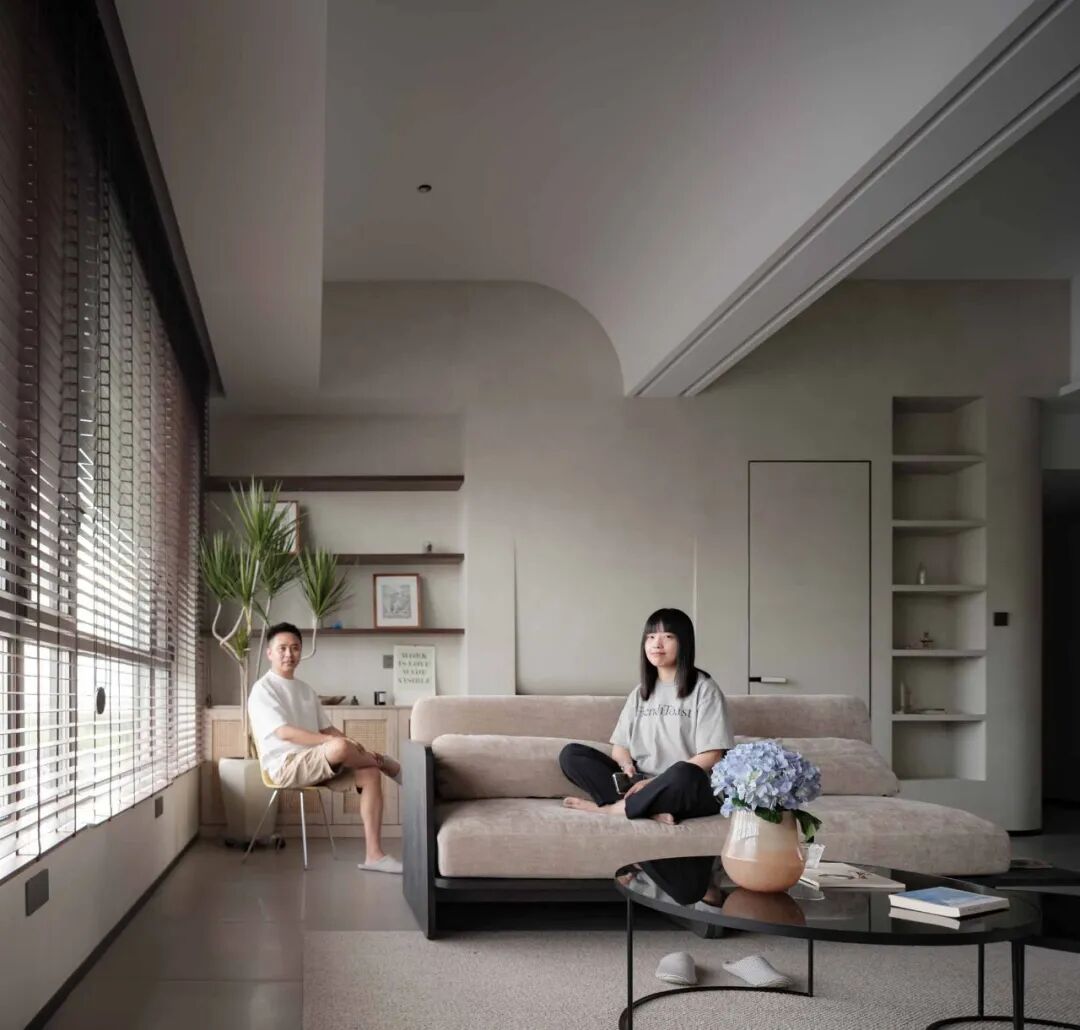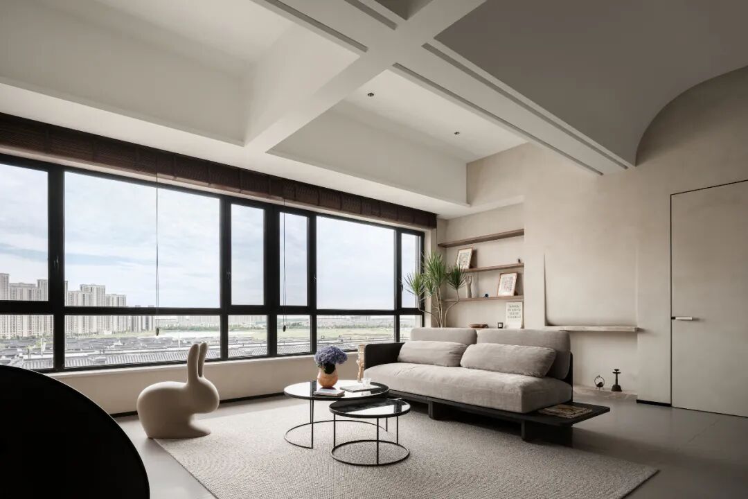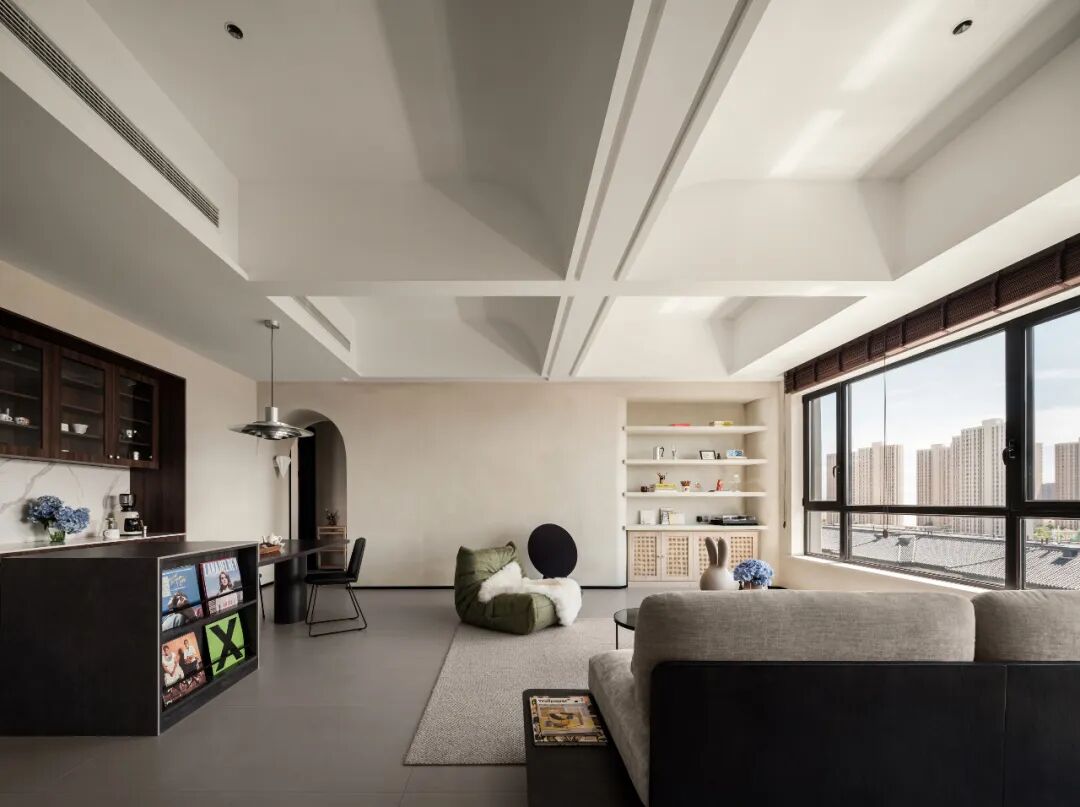 屋主对这个新家的设想:喜欢大开间格局,希望能将特殊的封顶结构与家完美融合.希 望保留客厅的观景窗,让窗外美景与窗内的家浑然一体.需要一间书房,融合绘画、办公和收纳多功能;增设大量的展示型储物空间,让每一种热爱都有容身之地。