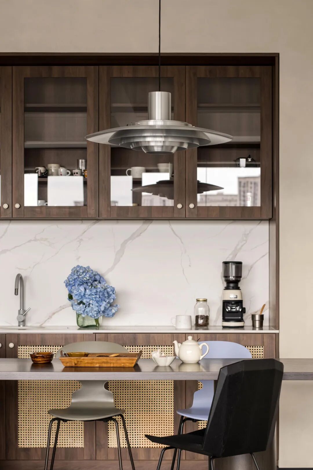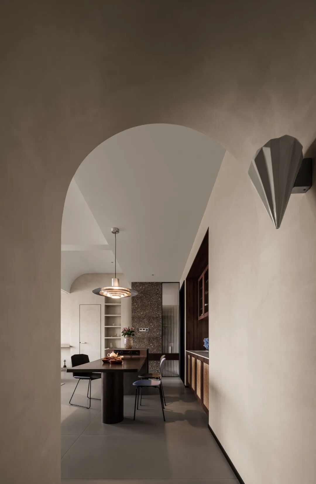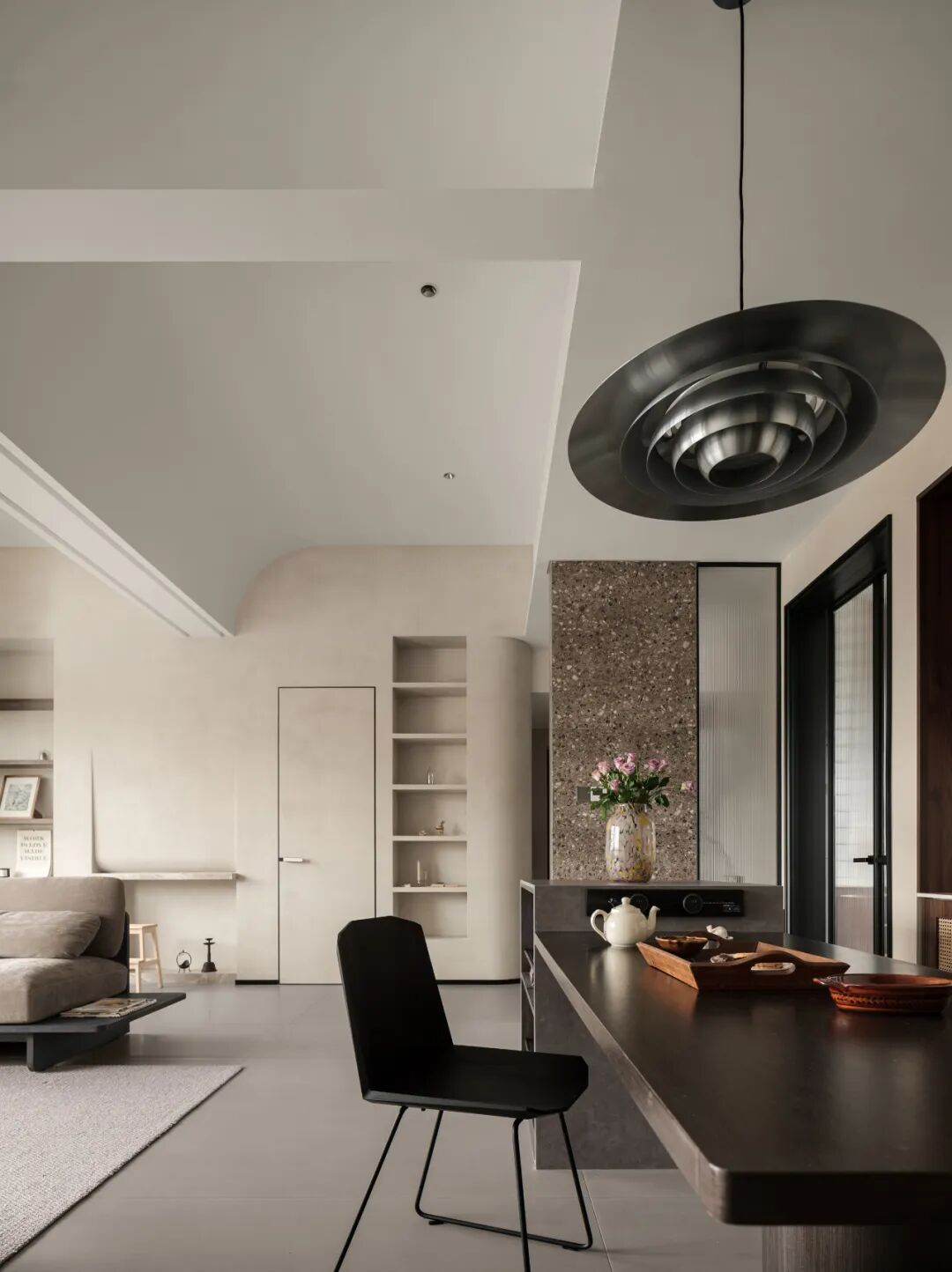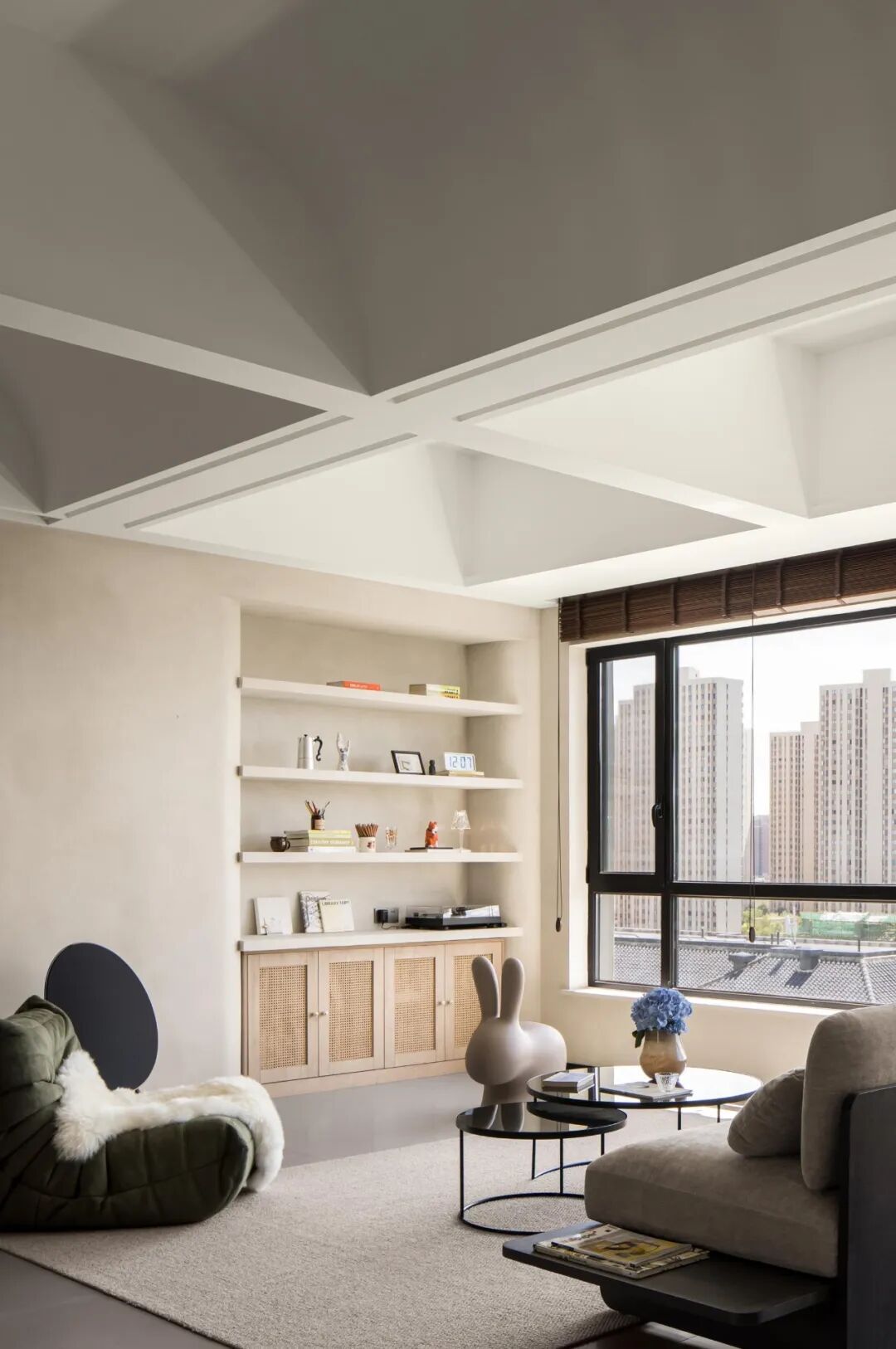 屋主对这个新家的设想:喜欢大开间格局,希望能将特殊的封顶结构与家完美融合.希 望保留客厅的观景窗,让窗外美景与窗内的家浑然一体.需要一间书房,融合绘画、办公和收纳多功能;增设大量的展示型储物空间,让每一种热爱都有容身之地。