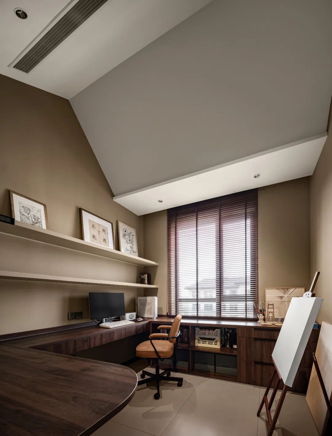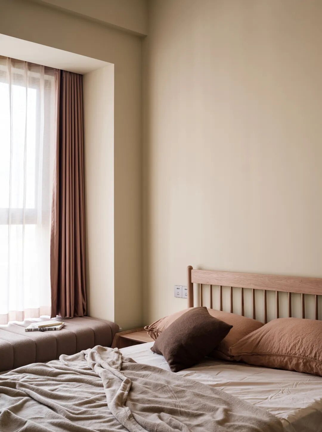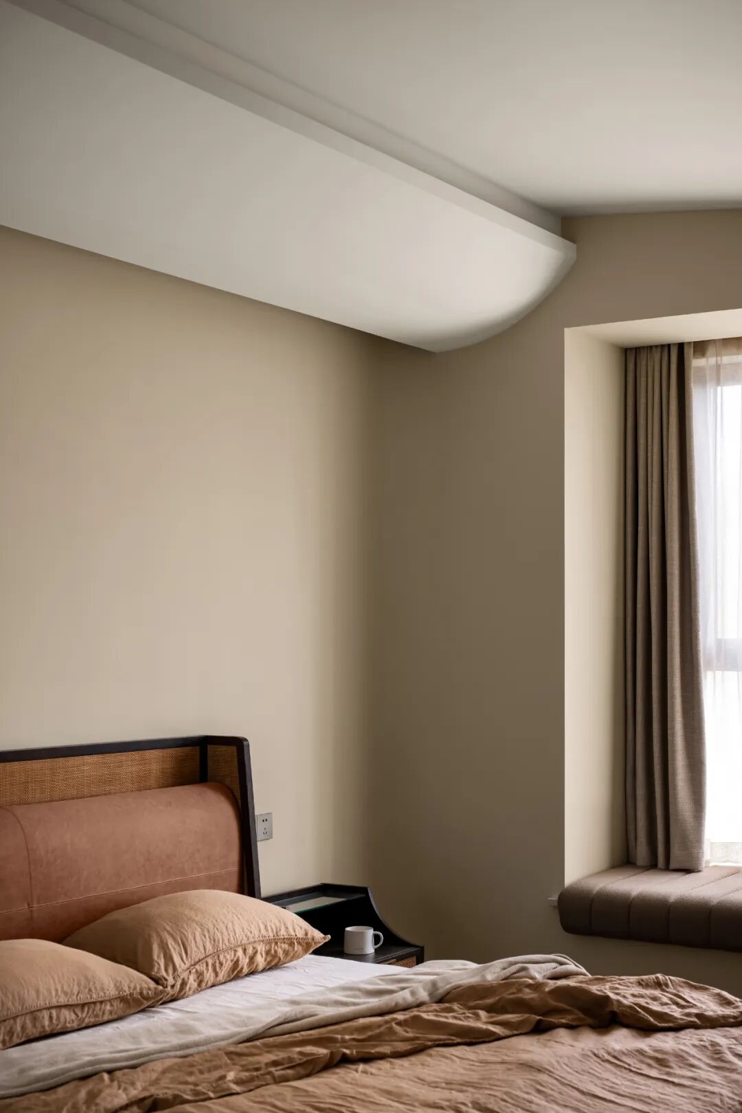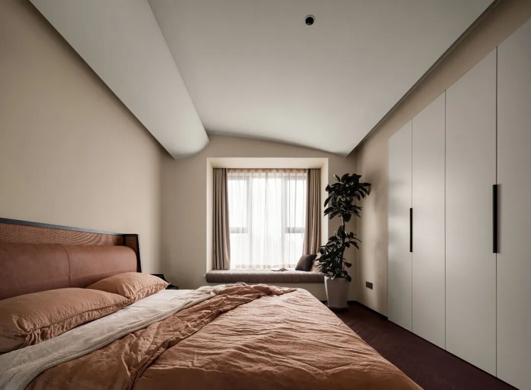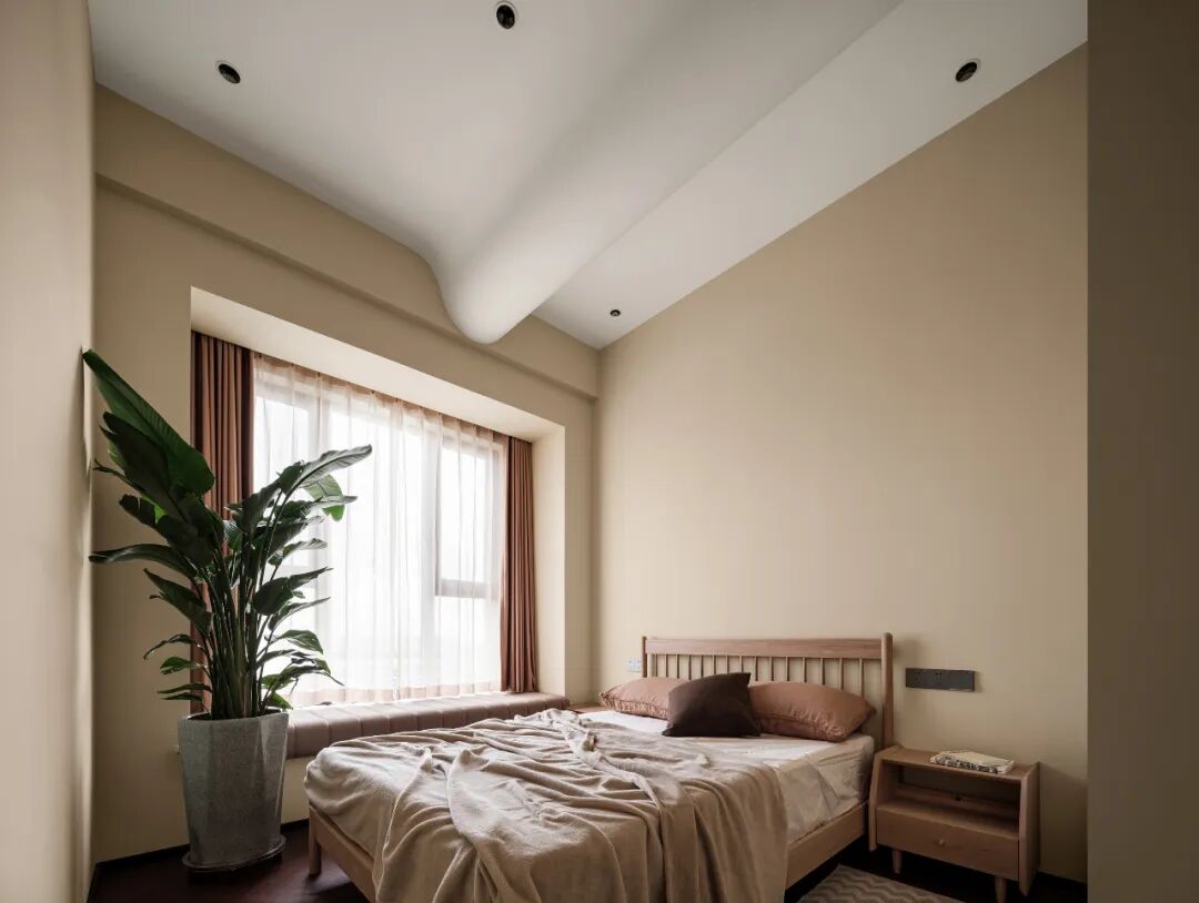 低饱和度的墙漆,搭配同色系或浅棕或杏色的床品,让卧室享有绝对的开阔舒适感。治愈奶茶色,塑造了主卧恬静的氛围,入眠轻松无负担。此外,由于卧室顶面是斜顶结构,特意做出了弧形的跌级造型,弱化吊顶带来的突兀感。