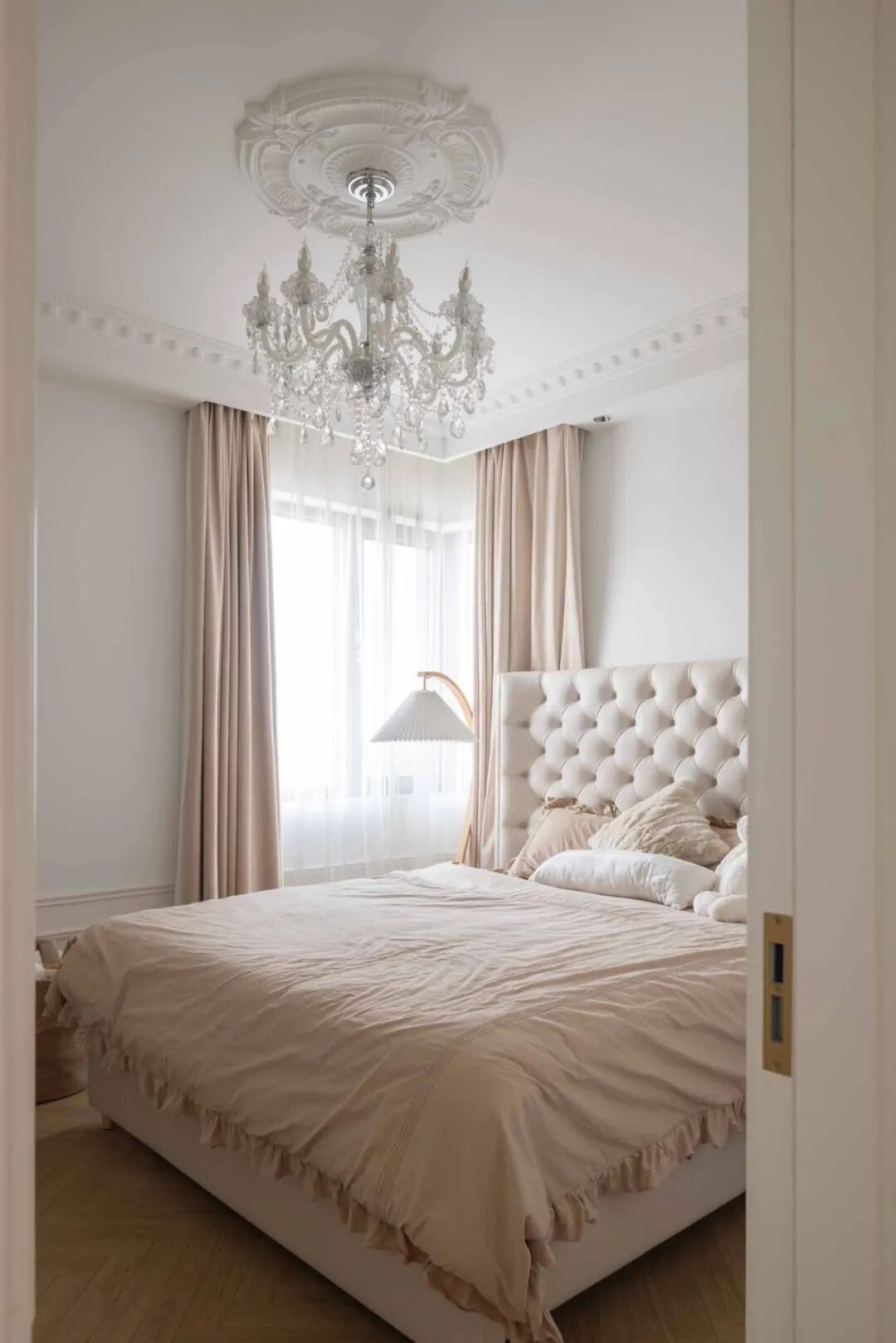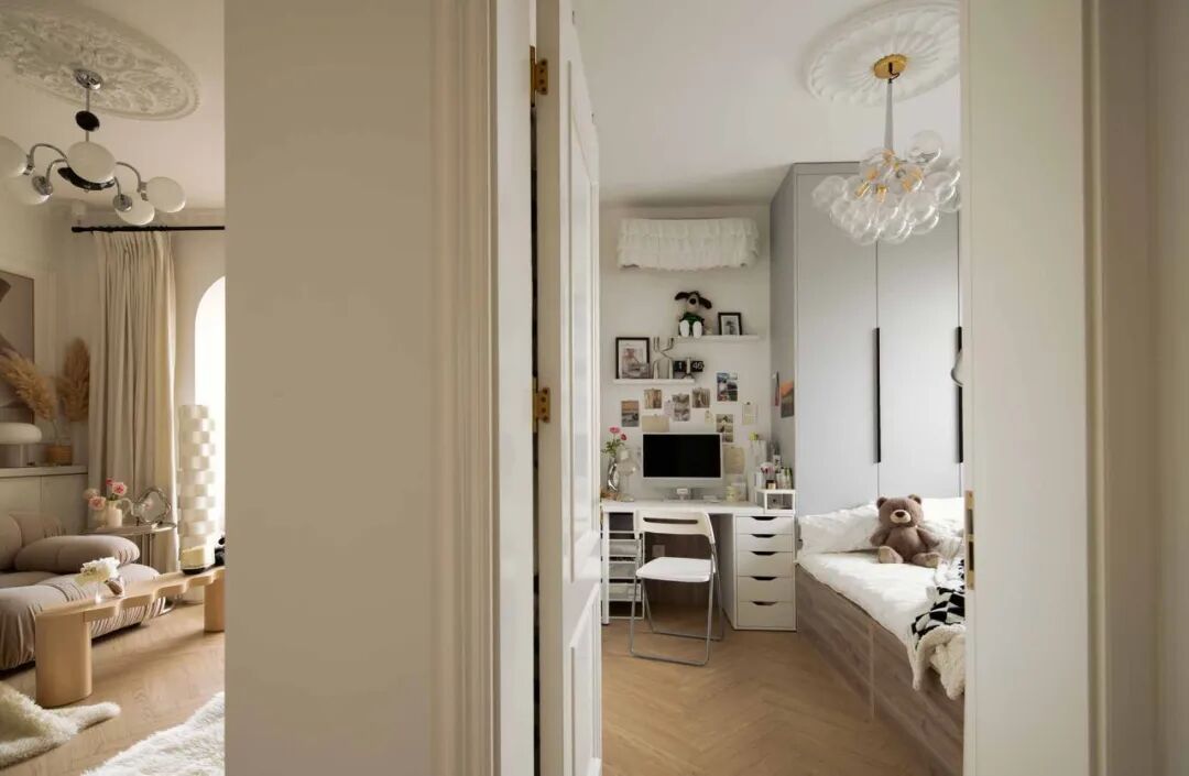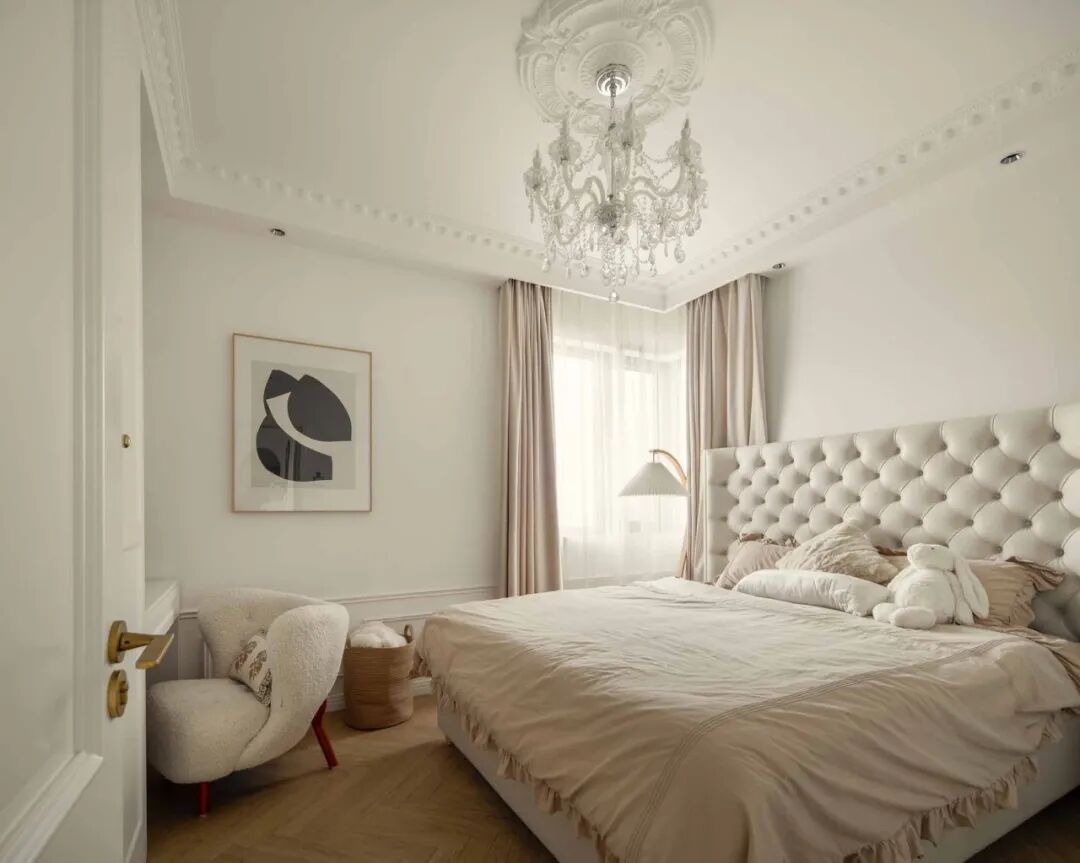主卧是温柔的奶茶色系,整个房间都是法式轻奢风的香槟色调,温柔得像一杯午后的杏仁燕麦拿铁,低饱和度的配色会给人一种慵懒的感觉,适合法式的“慢节奏”。搭配一盏轻奢风的法式水晶吊灯,梦幻迷人的灯饰悬于雕花灯盘之上,满满的法式电影感。