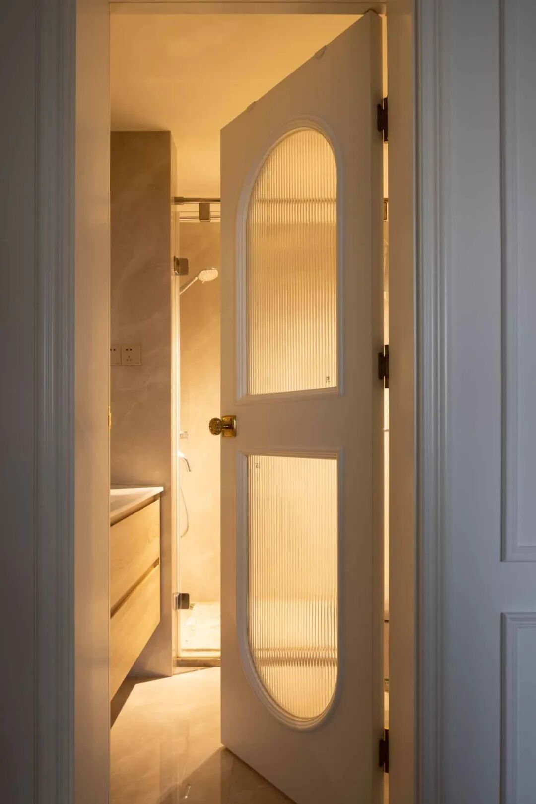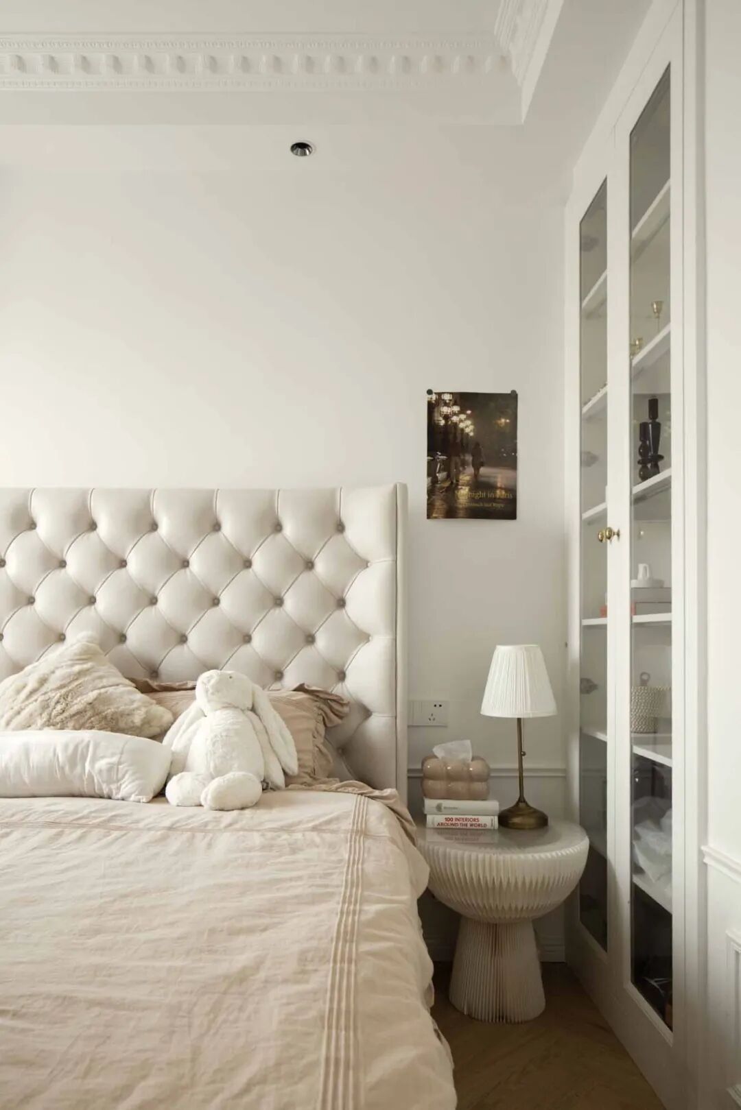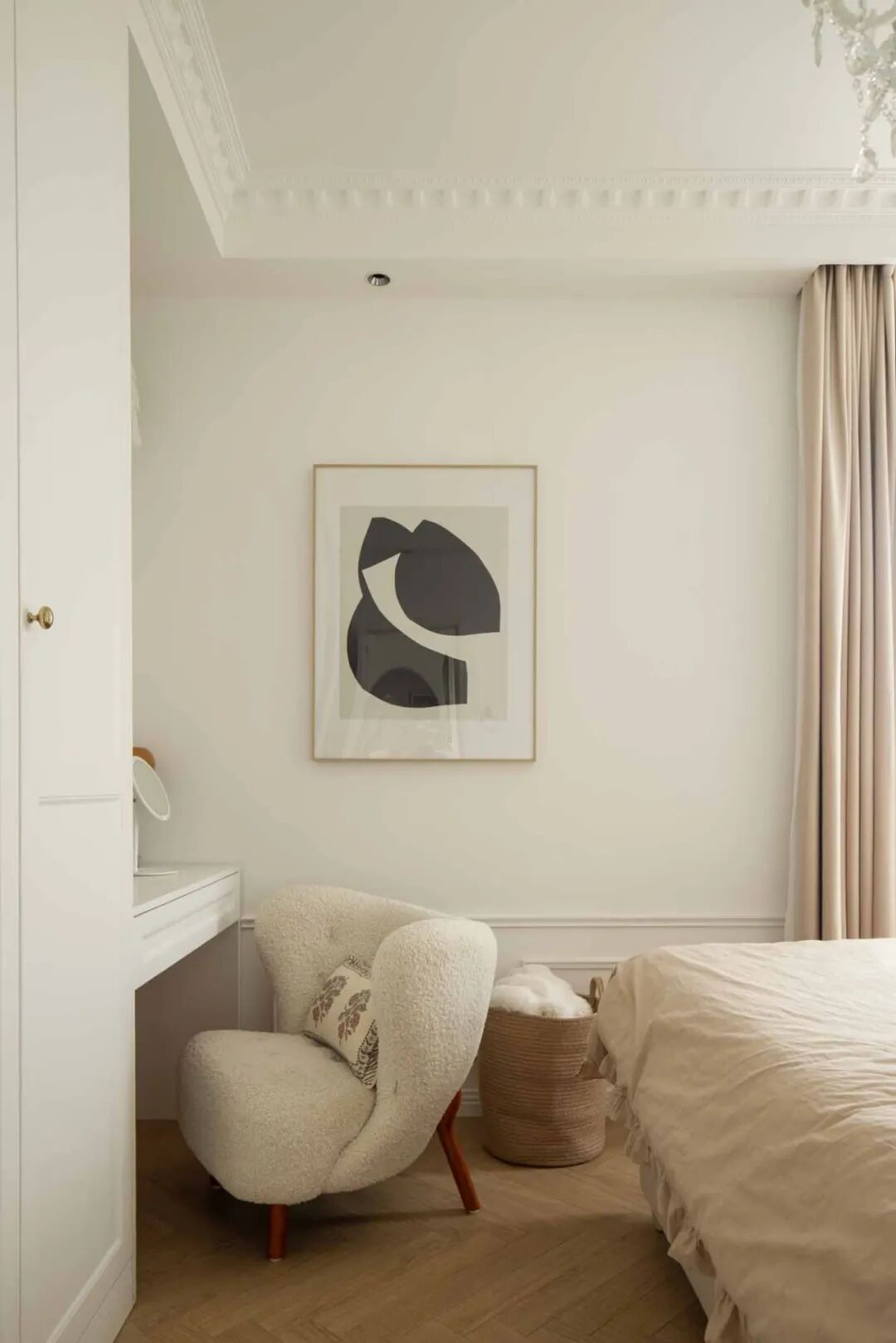 主卧是温柔的奶茶色系,整个房间都是法式轻奢风的香槟色调,温柔得像一杯午后的杏仁燕麦拿铁,低饱和度的配色会给人一种慵懒的感觉,适合法式的“慢节奏”。搭配一盏轻奢风的法式水晶吊灯,梦幻迷人的灯饰悬于雕花灯盘之上,满满的法式电影感。