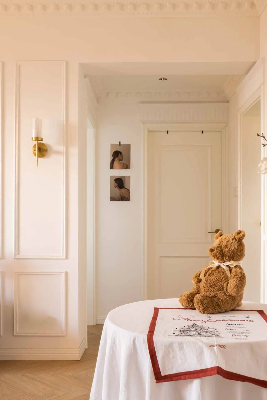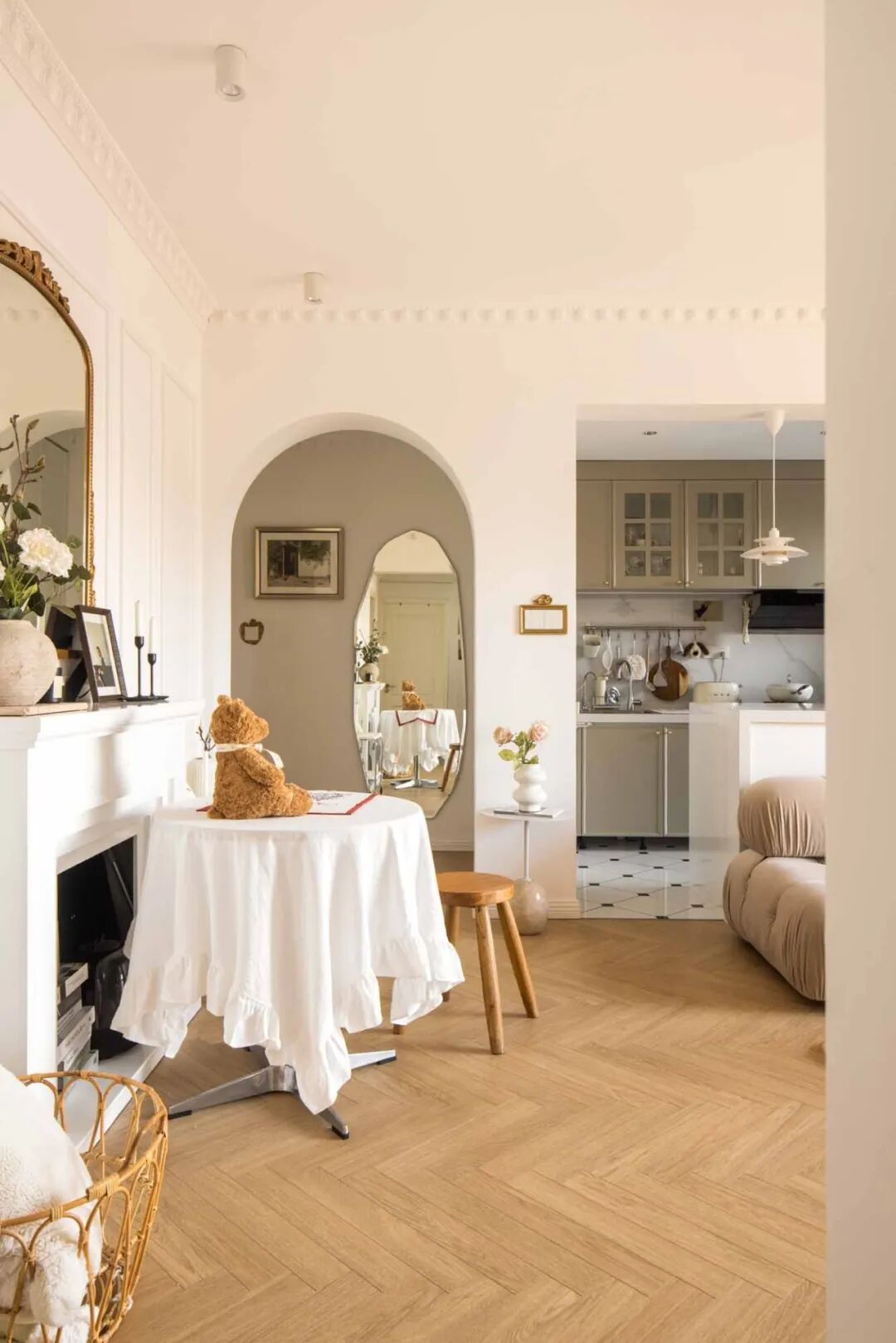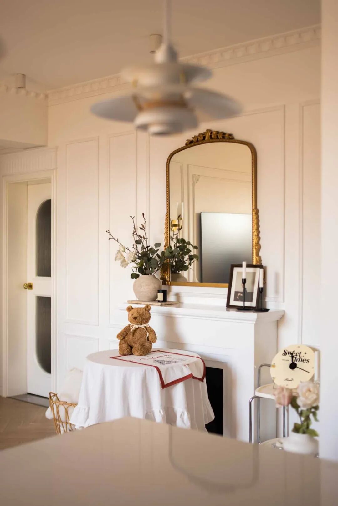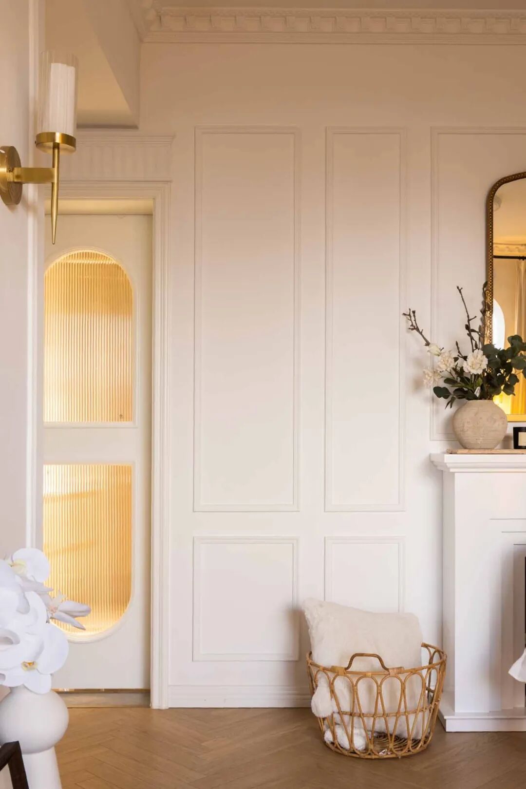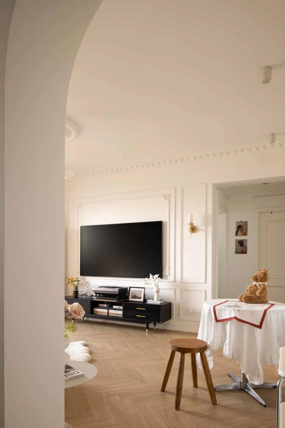 壁炉台面摆上喜爱的烛台、插花、装饰画等复古小物,用热爱装扮生活空间。通往卧室的走廊,通体大白墙略显单调,以横梁的不同高度以及立体石膏线提升层次感,让扁平墙面看起来更加立体。