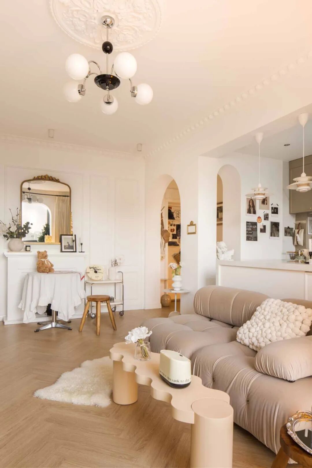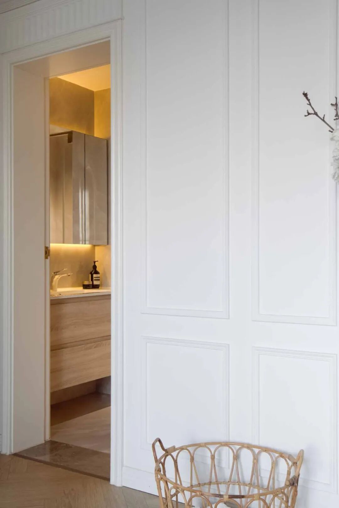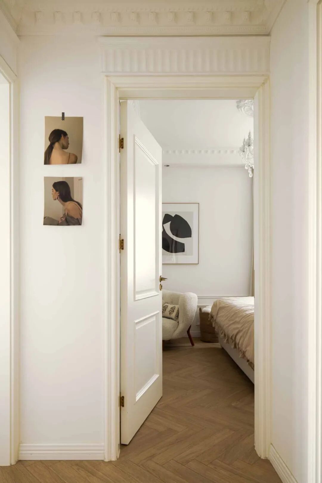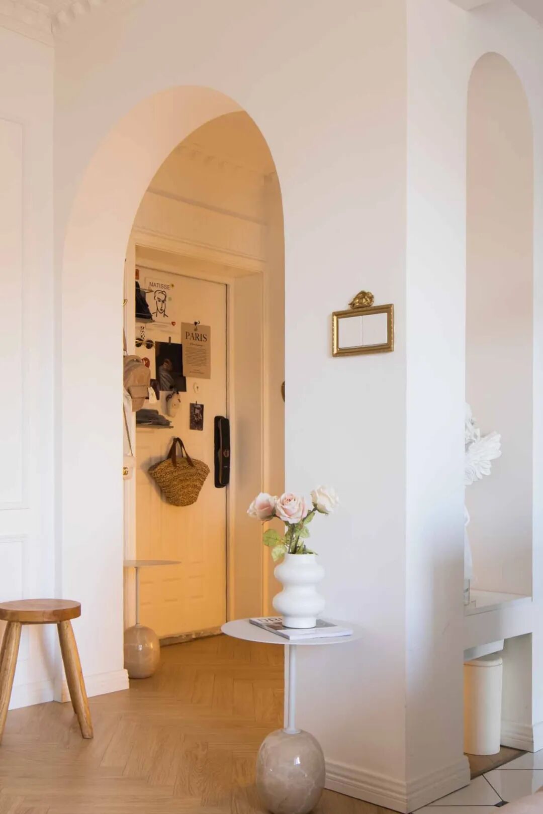 壁炉台面摆上喜爱的烛台、插花、装饰画等复古小物,用热爱装扮生活空间。通往卧室的走廊,通体大白墙略显单调,以横梁的不同高度以及立体石膏线提升层次感,让扁平墙面看起来更加立体。
