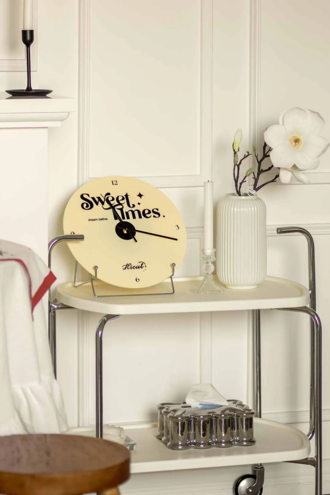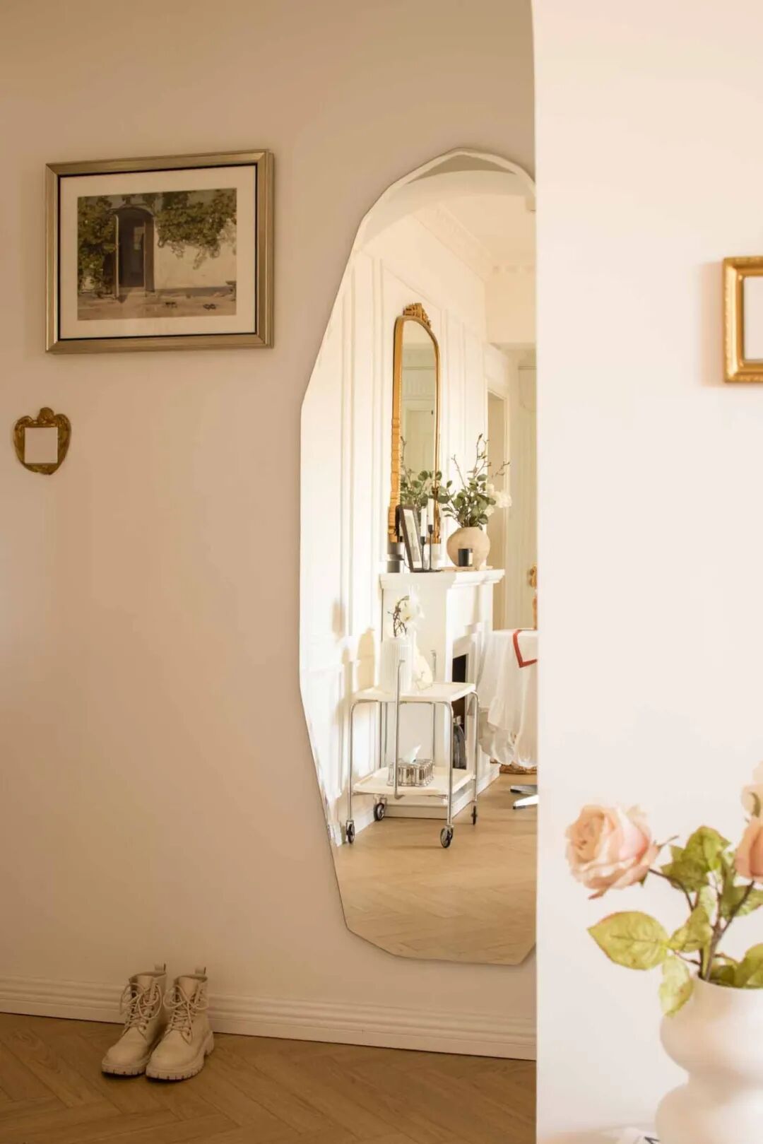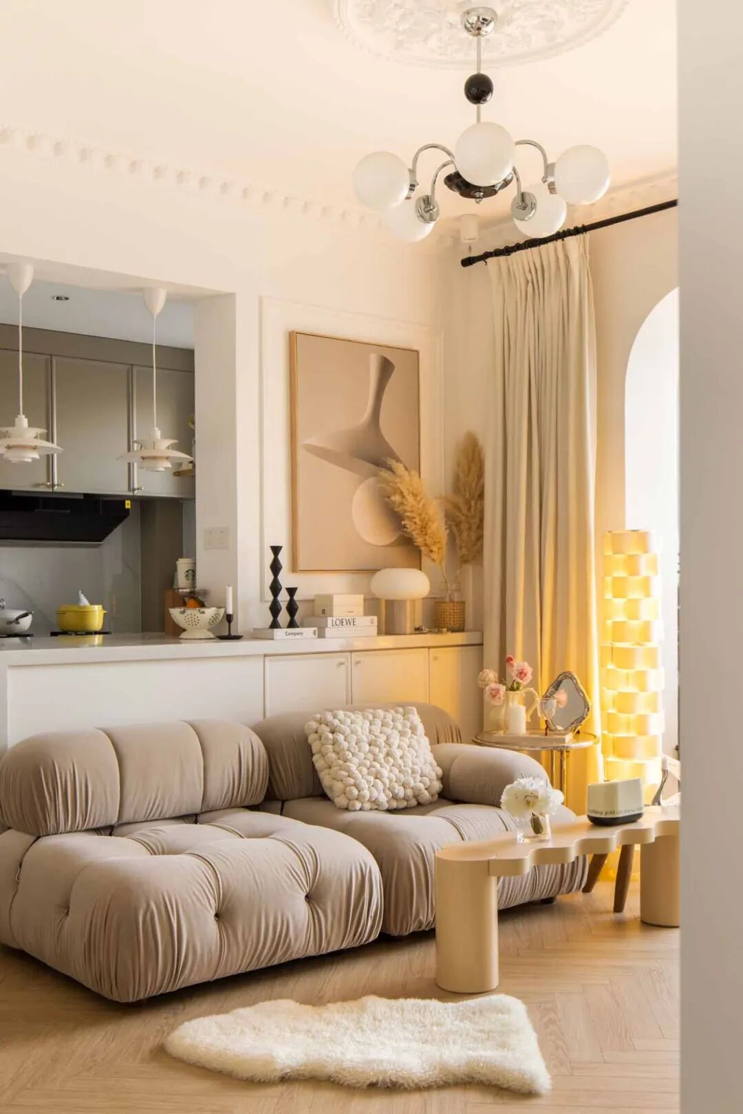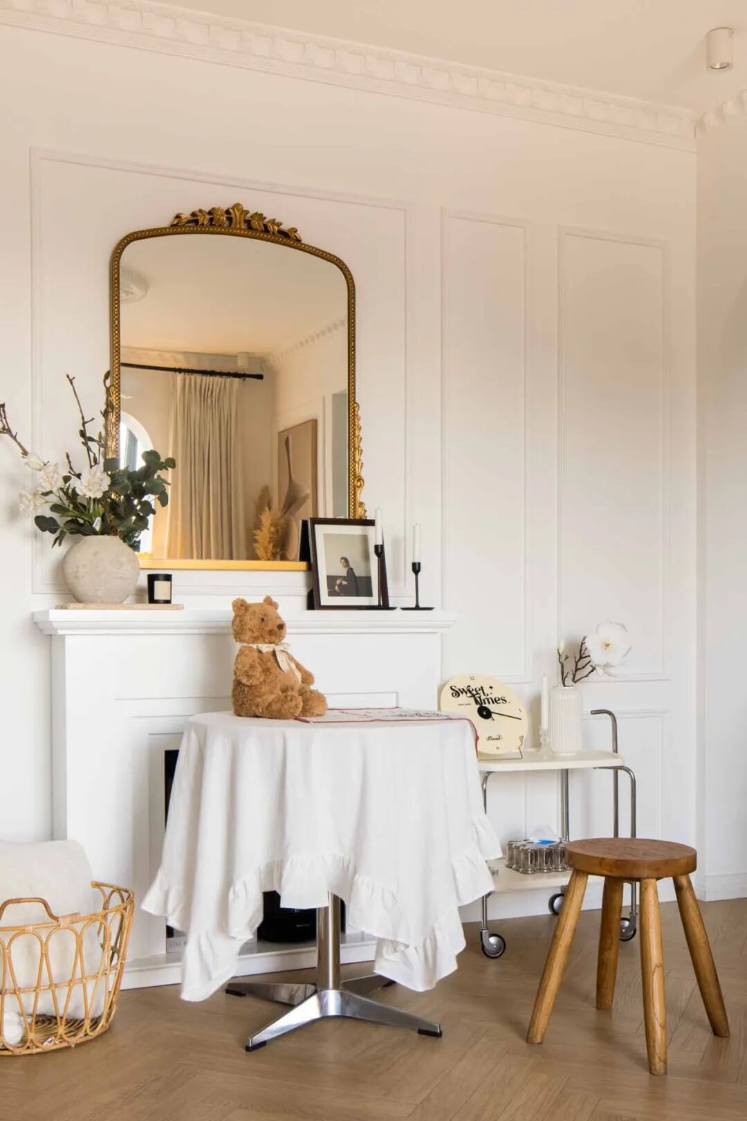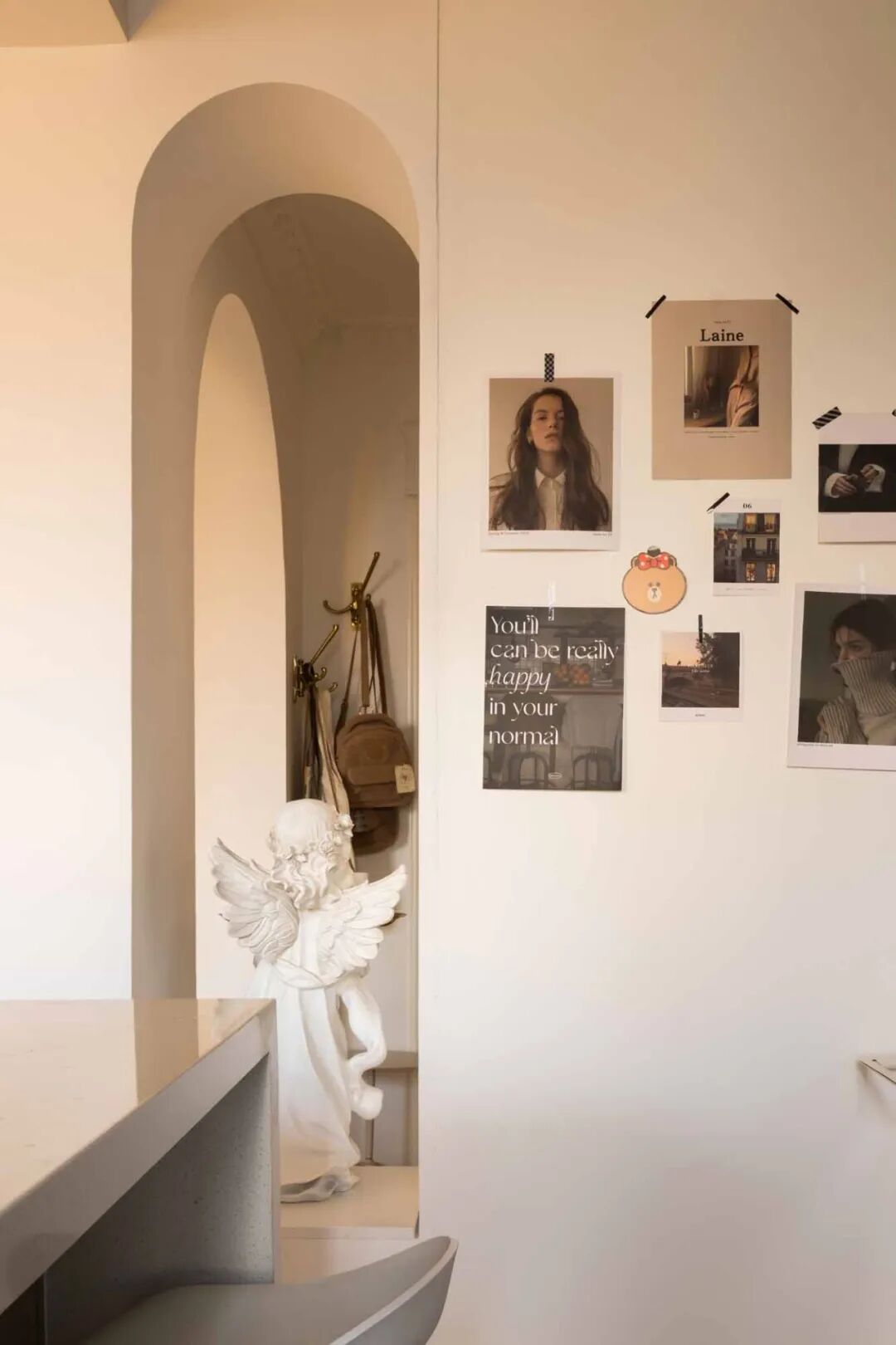 壁炉台面摆上喜爱的烛台、插花、装饰画等复古小物,用热爱装扮生活空间。通往卧室的走廊,通体大白墙略显单调,以横梁的不同高度以及立体石膏线提升层次感,让扁平墙面看起来更加立体。