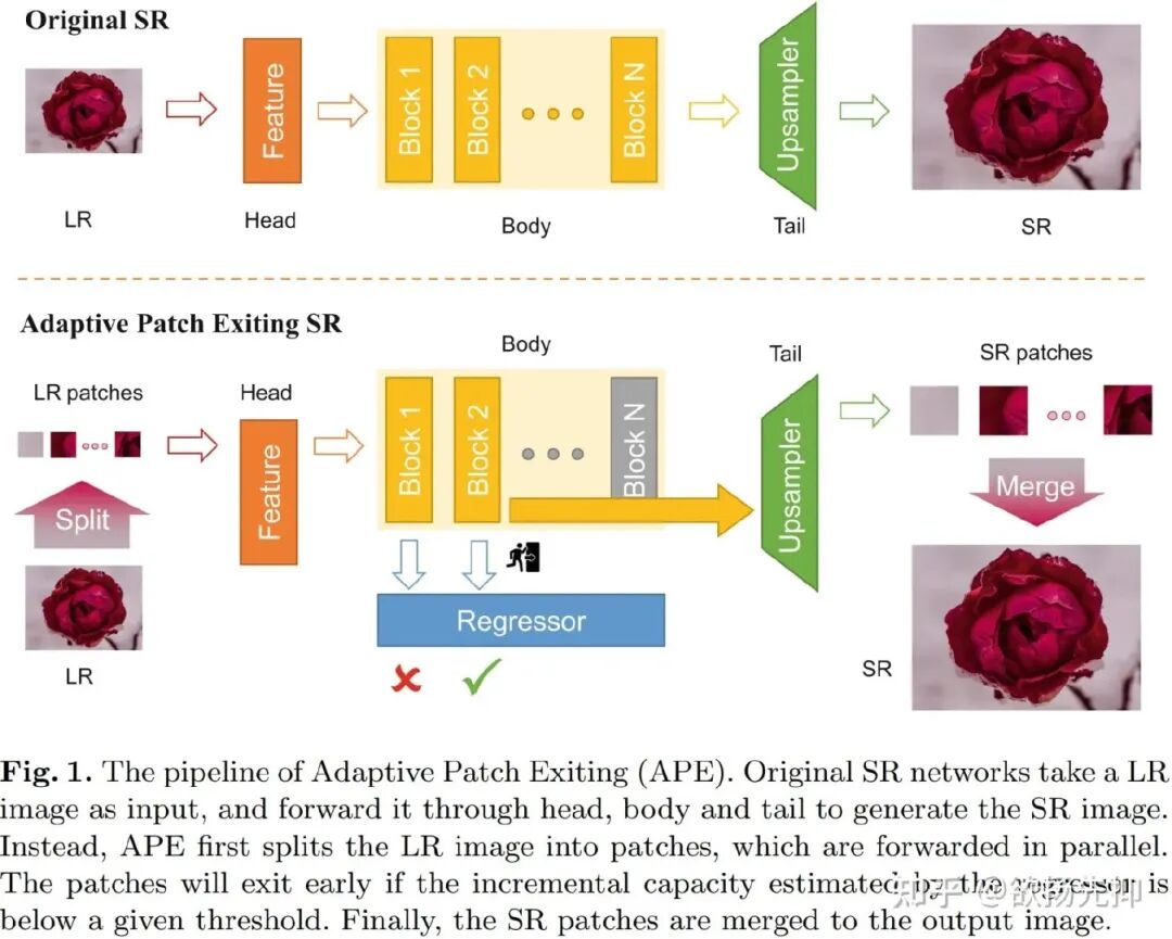 针对这一问题,作者提出了一个scalable的策略 Adaptive Patch Exiting (APE) 。更具体地,作者训练了一个regressor来预测每一个layer中的patch的incremental capacity。通过incremential capacity能够评估每一个layer的必要性。一旦incremental capacity低于一个阈值,patch可以从一个特殊的层退出。作者提出的这些方法能够简单的平衡performance和efficiency,通过改变incremental capacity的阈值。更多地,作者提出了一个策略能够联合训练regressor和SR network。