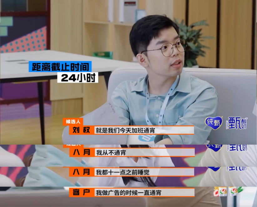不似人们印象中医生、教师这类职业的稳重和奉献,广告行业充满着“不安分”的活力。在先导片中,轻熟广告人们的职场宣言就能一窥其不羁的态度:充满野心目标明确的社牛刘权、拒绝内卷用实力说话的八月、整顿职场自信睥睨的小龙、古灵精怪内心丰富的社恐妙妙……如果说00后的整顿职场凭的是一股初生牛犊不怕虎的无畏,那么轻熟职场人的坚持与拒绝,凭的是在工作阅历中沉淀下来的能力与底气。