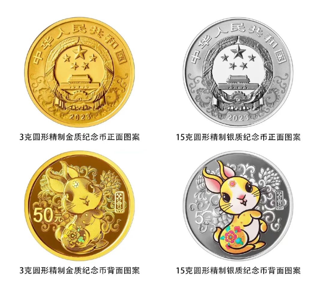 为中国金币总公司设计的癸卯年(兔)生肖金银纪念币: