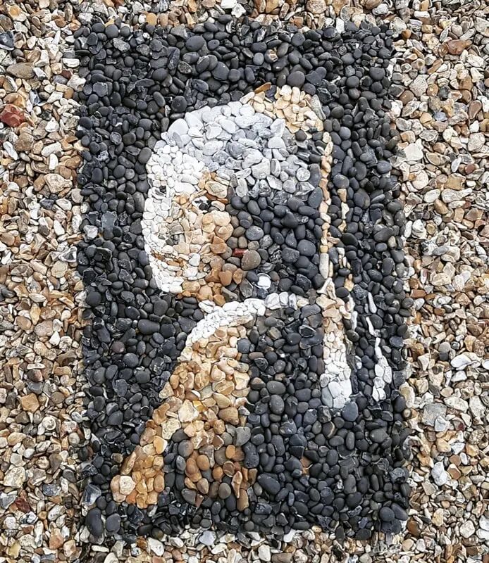 贾斯汀·贝特曼最擅长摆放肖像画,尤其是古典画作中的人物。几百颗大小不同,形态、颜色各异的石头,在这位艺术家的手中,似乎变得非常“顺从”,色彩深浅不同的石头,被他安排得明明白白,人物面部的轮廓、明暗关系,就在艺术家一点一点的拼凑中,慢慢呈现出来。