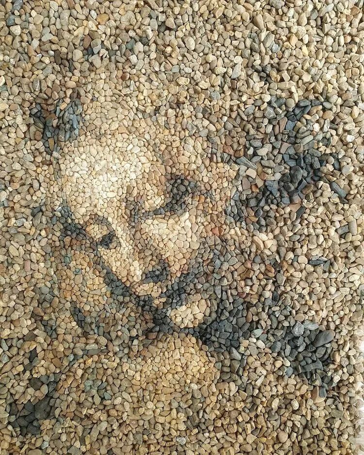 从近处看,贾斯汀·贝特曼摆放的石头就像一幅马赛克画作,与一些现代艺术作品的效果很像,从远处看,视觉效果更强烈,就像一幅印象派画作。为了营造出“画”的感觉,这位艺术家还用细碎的石头,为每一个作品做了一个画框,这样让人看起来,他从石头摆放的图案,俨然就是一幅幅手绘肖像画,就像现场写生的绘画作品没两样。