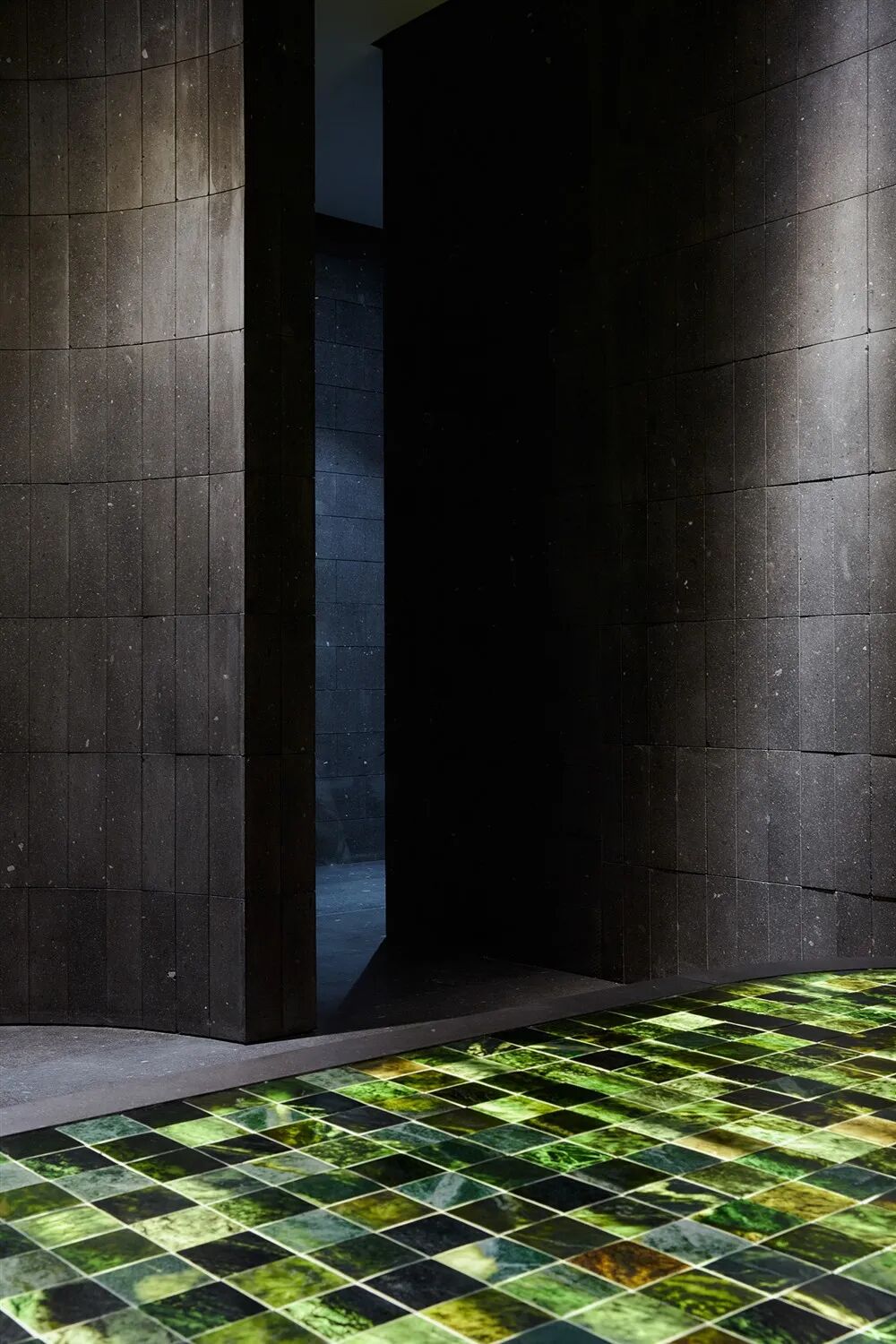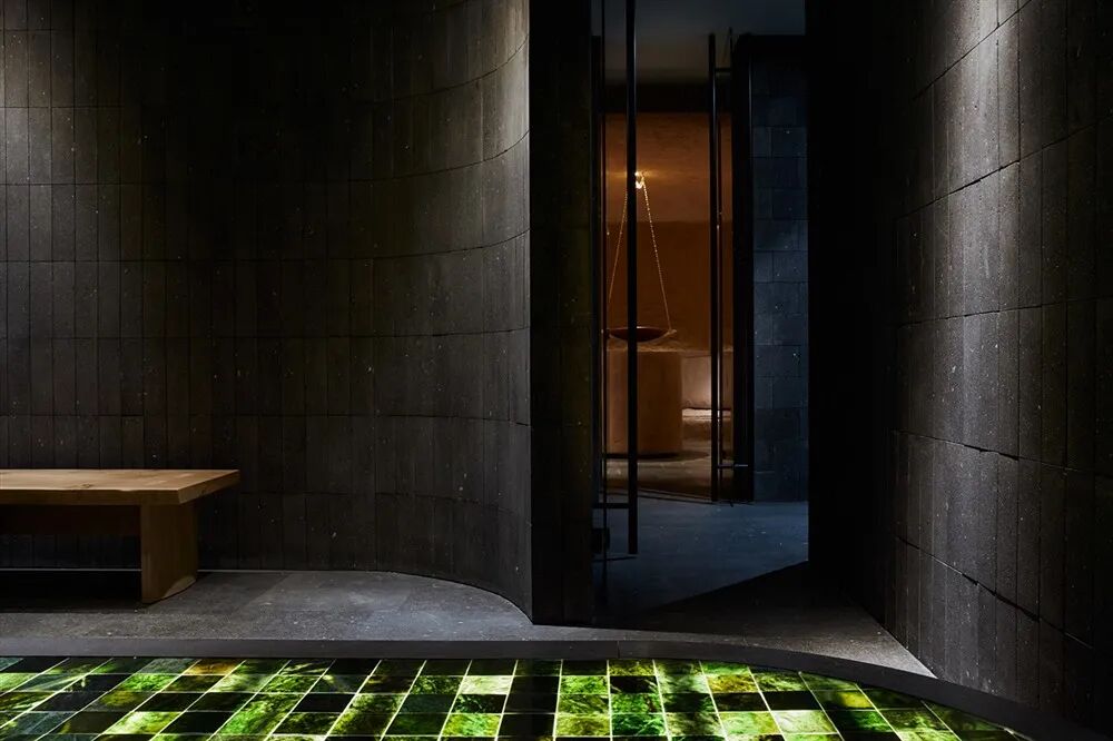 玉房由天然玄武岩和黑色凝灰岩制成。在中心有一个巨大的加热讲台,上面镶着玉石。这个空间的主要概念是一个空房间,除了讲台之外,没有任何东西可以引起客人的注意。客人可以自由地坐在讲台上。