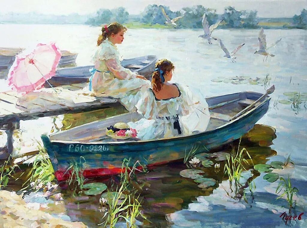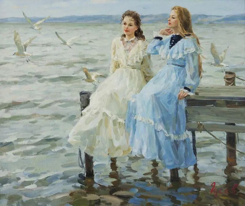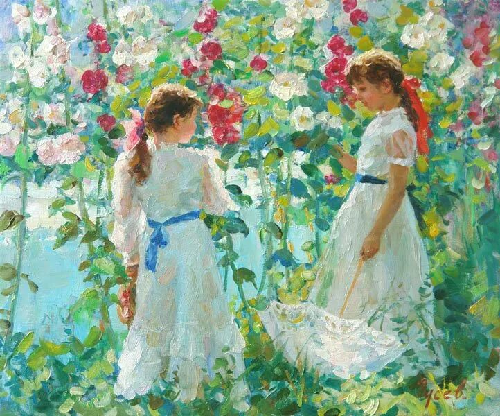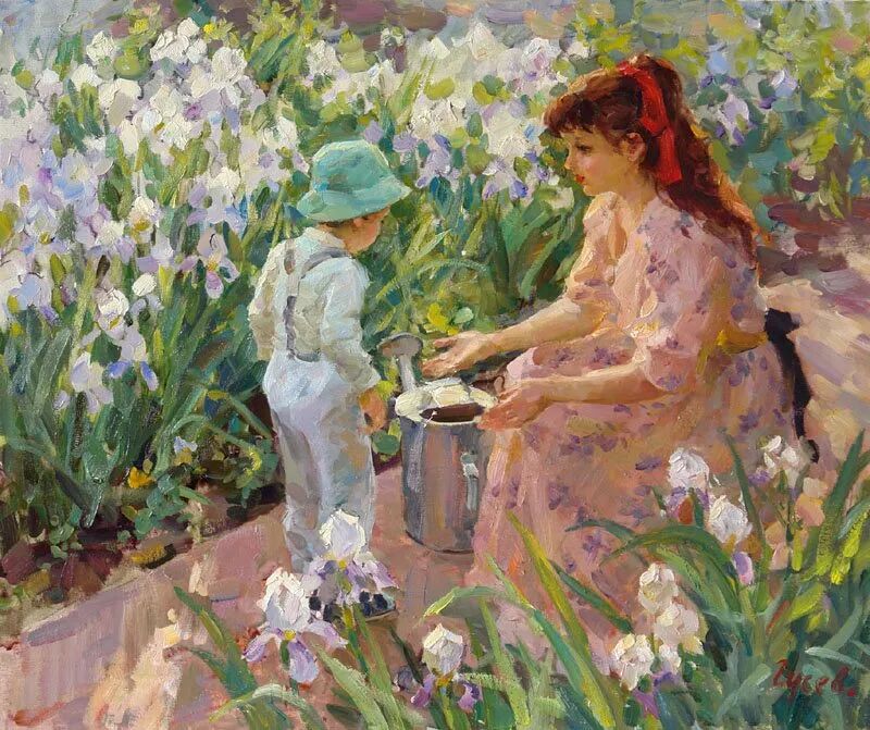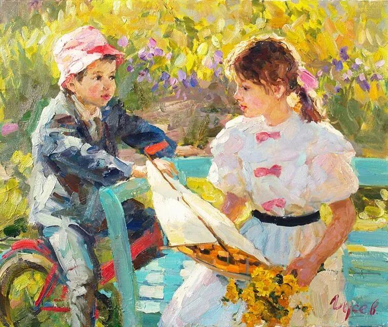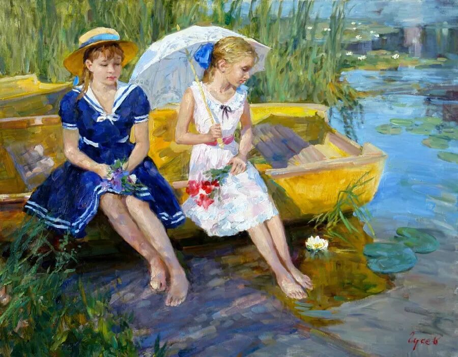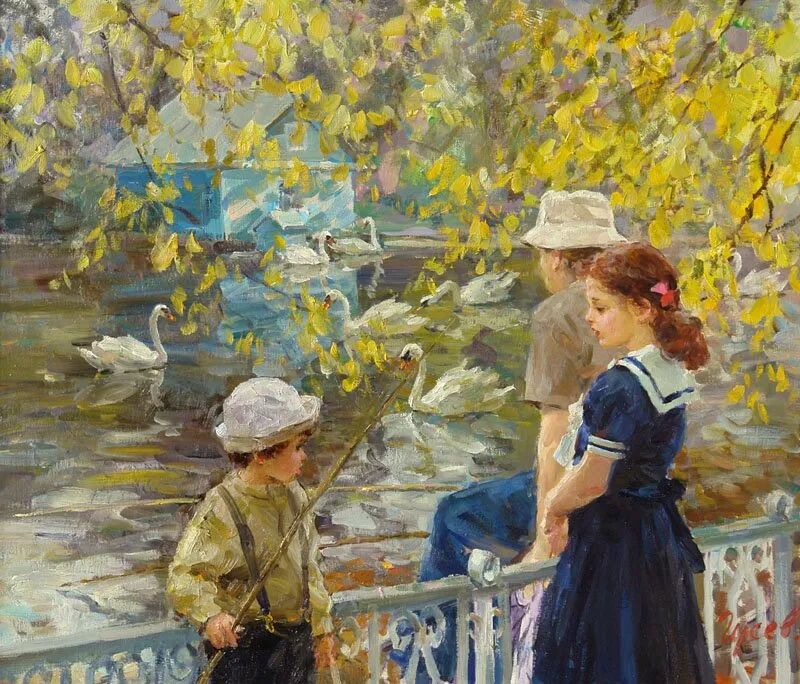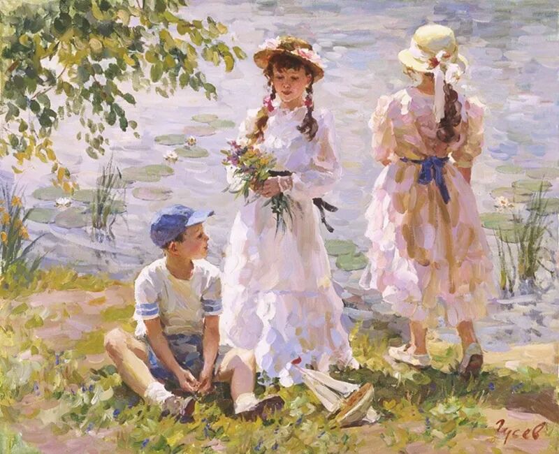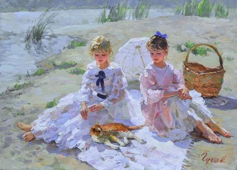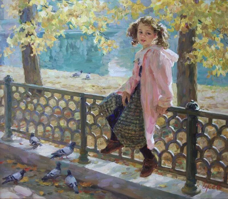 针对画面中的少女跟小孩,弗拉基米尔·古谢夫一共创作了两幅作品,但个人感觉这幅远远没有上一幅来得生动,难道是因为我们看不到上一张女孩的脸庞,引起我们无限的遐想?