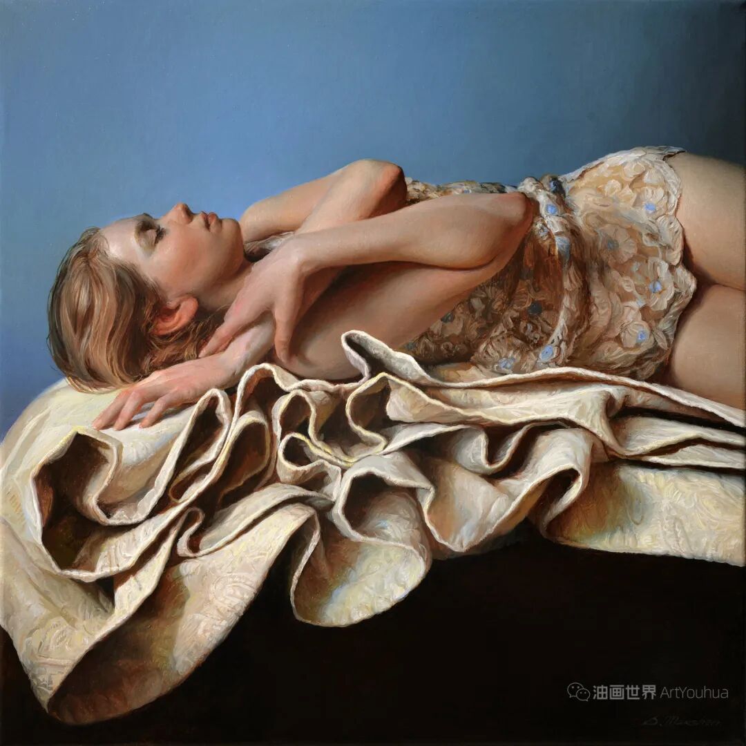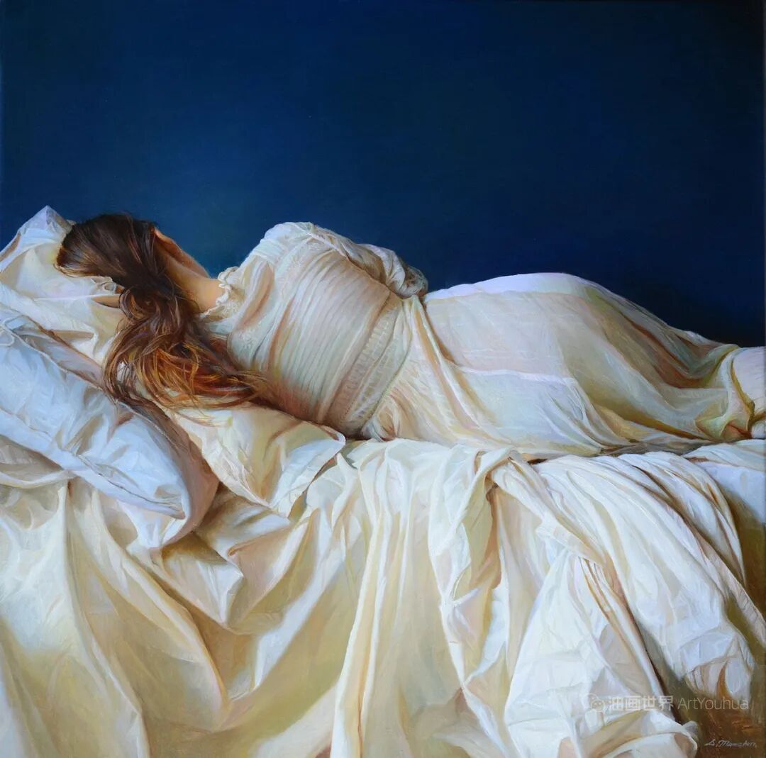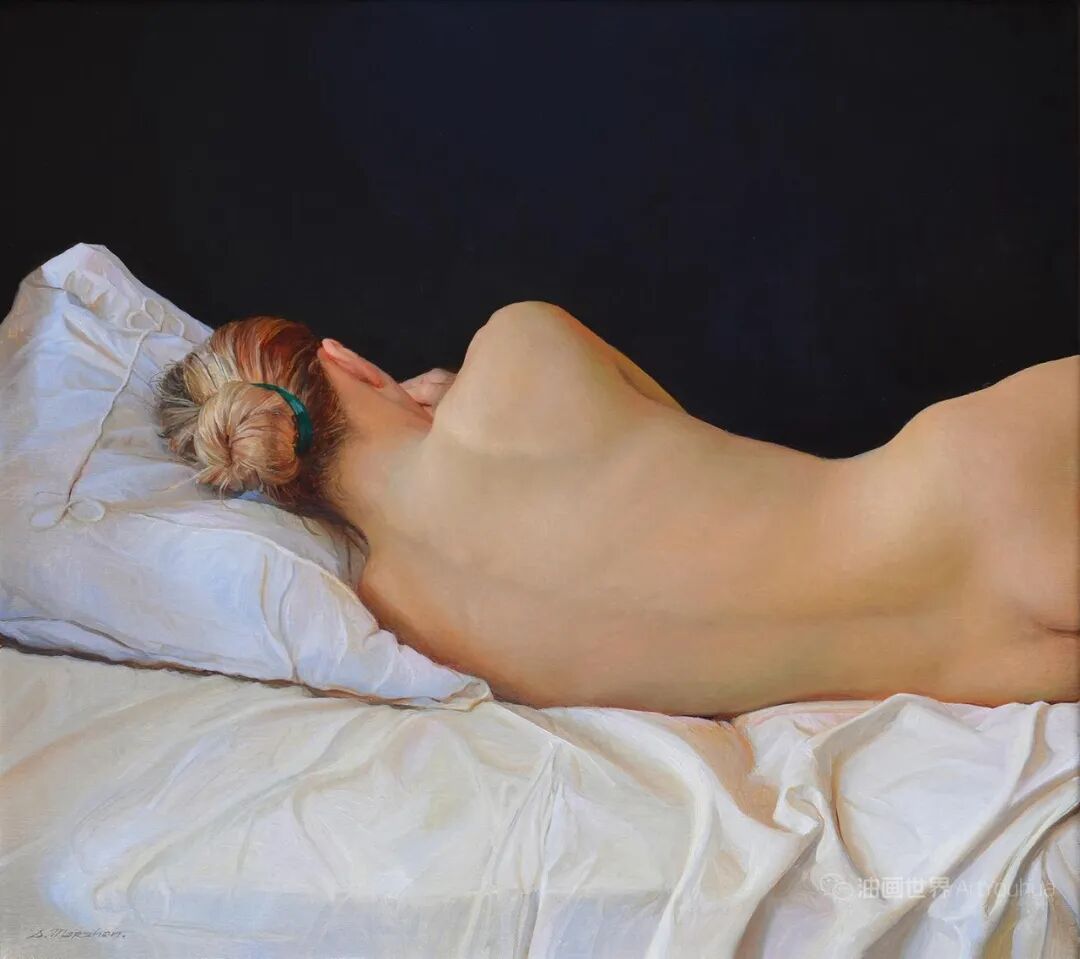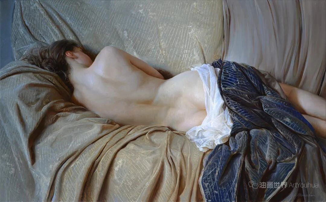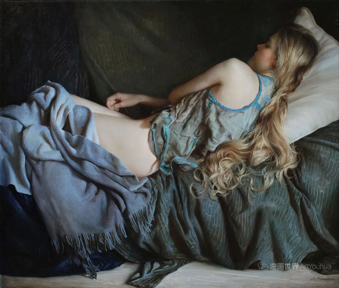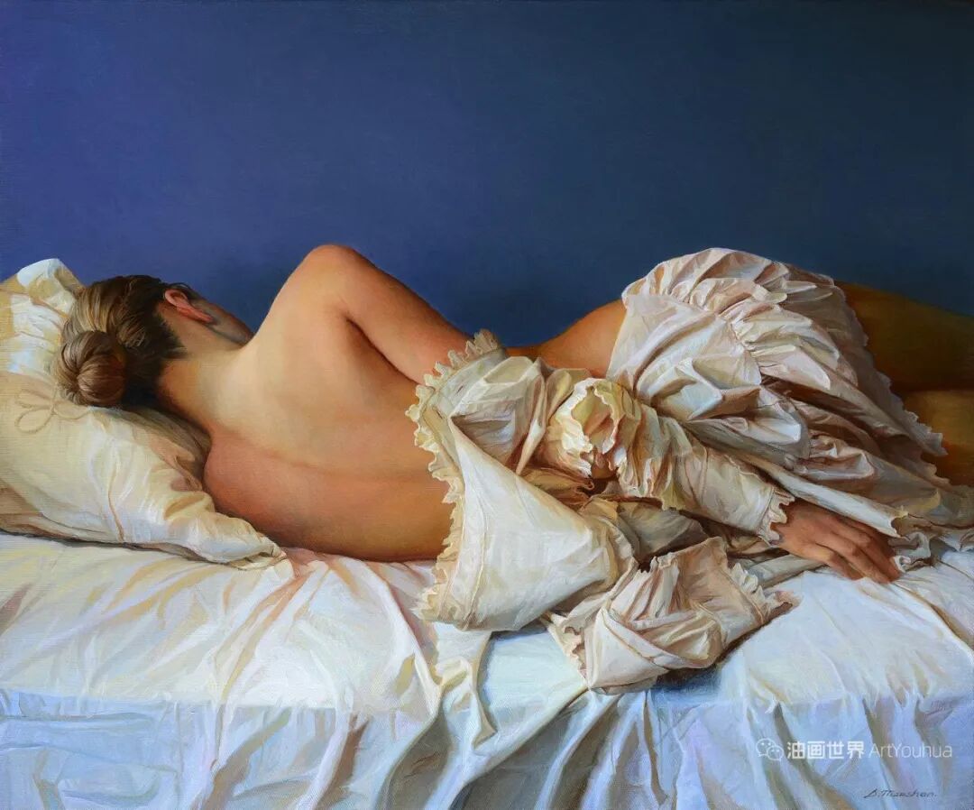 "我被Serge Marshennikov的诱人的女性油画肖像《海盗风格的床》所诱惑。马申尼科夫用他的模特的慵懒姿势、垂在她臀部的精致花边、以及奢华的床单、被子和温暖的枕头的深层褶皱来传达性感、女性的魅力和每天早上醒来时精致的艺术作品带来的无尽快乐的承诺。" ——托马斯·霍尔 (艺术评论家)