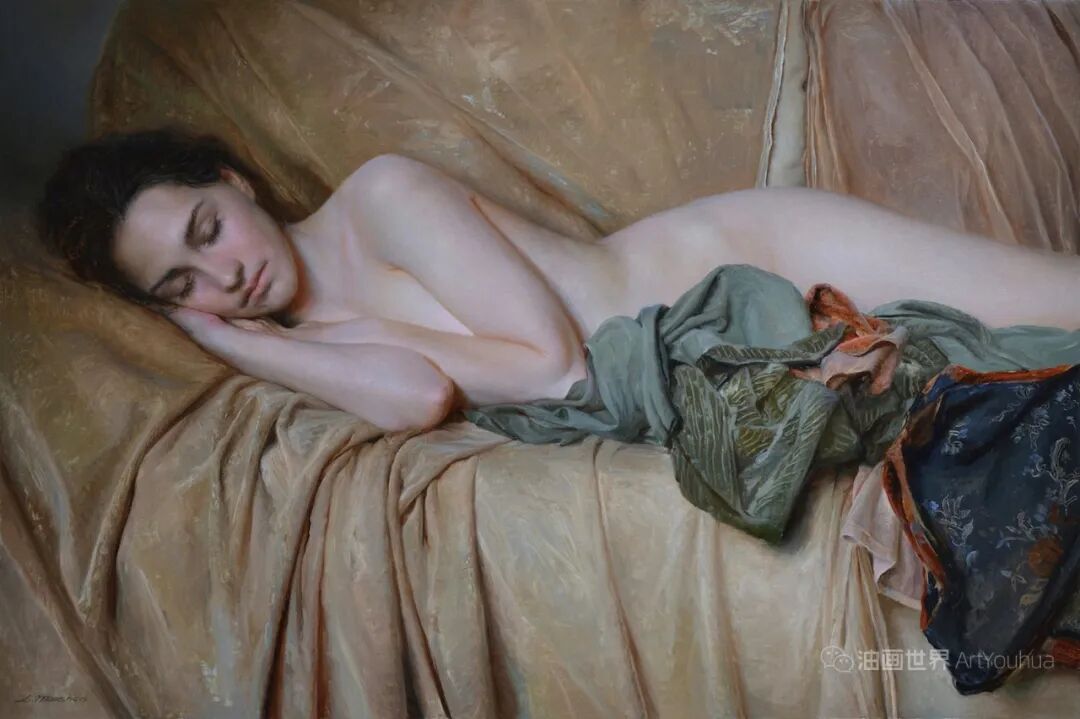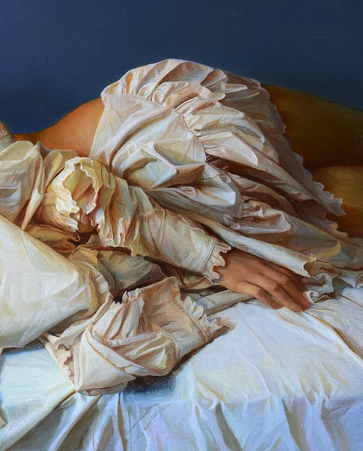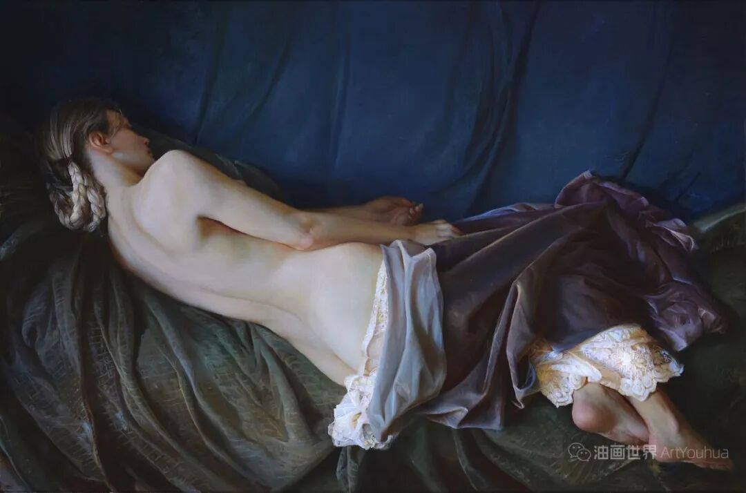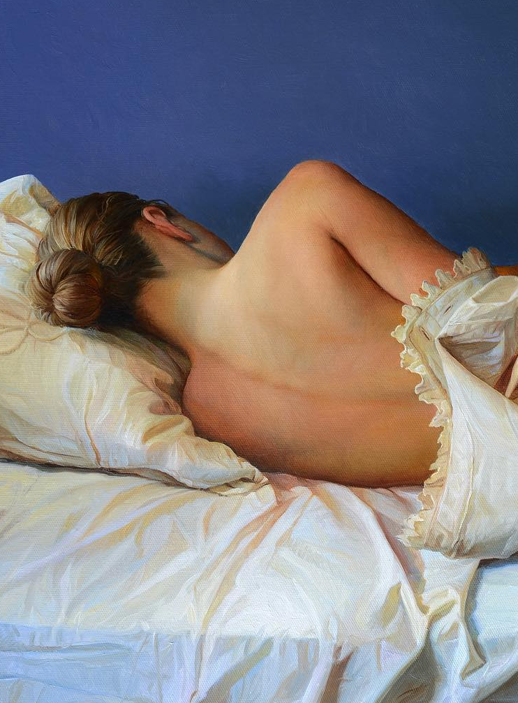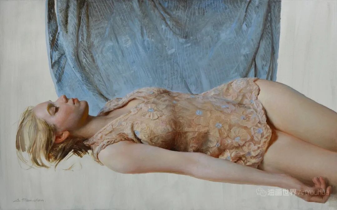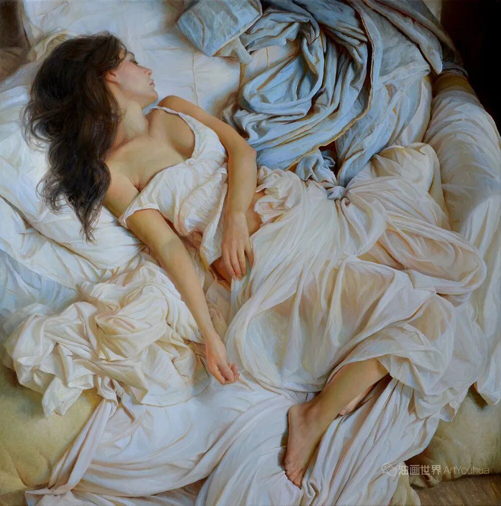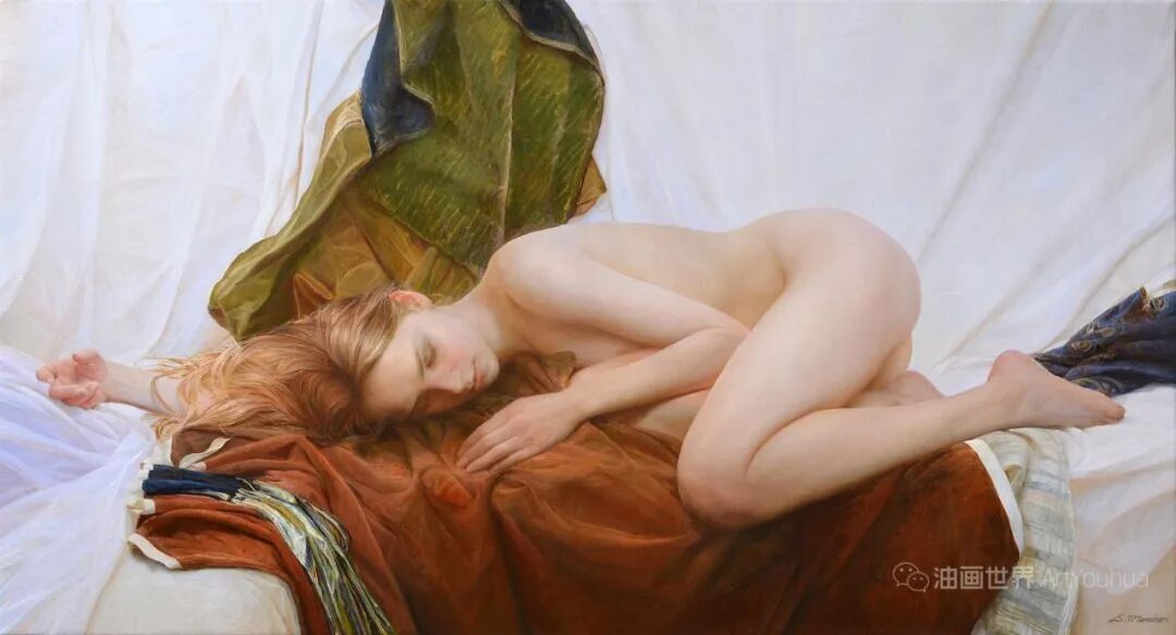 "我被Serge Marshennikov的诱人的女性油画肖像《海盗风格的床》所诱惑。马申尼科夫用他的模特的慵懒姿势、垂在她臀部的精致花边、以及奢华的床单、被子和温暖的枕头的深层褶皱来传达性感、女性的魅力和每天早上醒来时精致的艺术作品带来的无尽快乐的承诺。" ——托马斯·霍尔 (艺术评论家)
