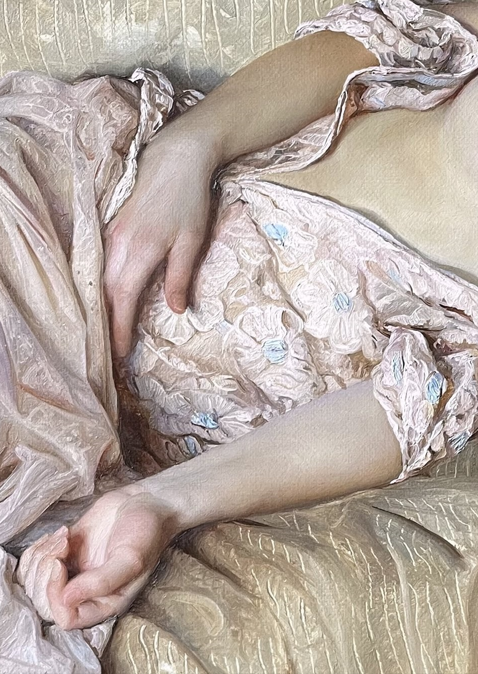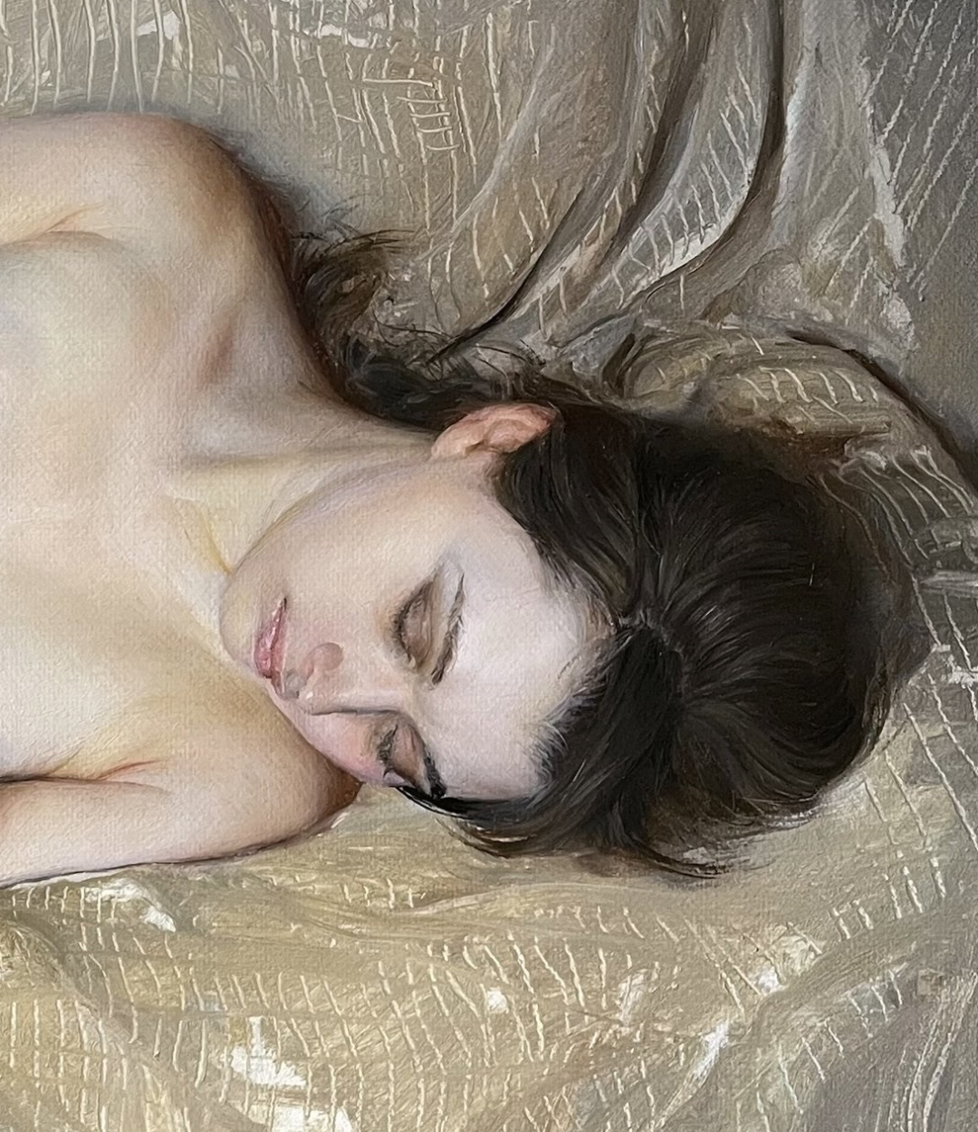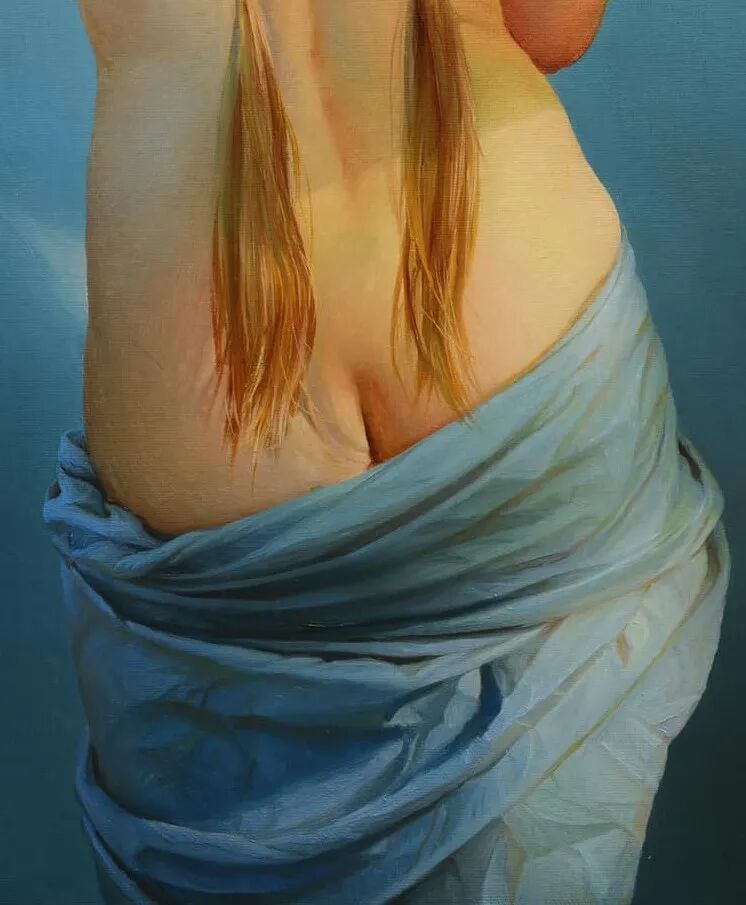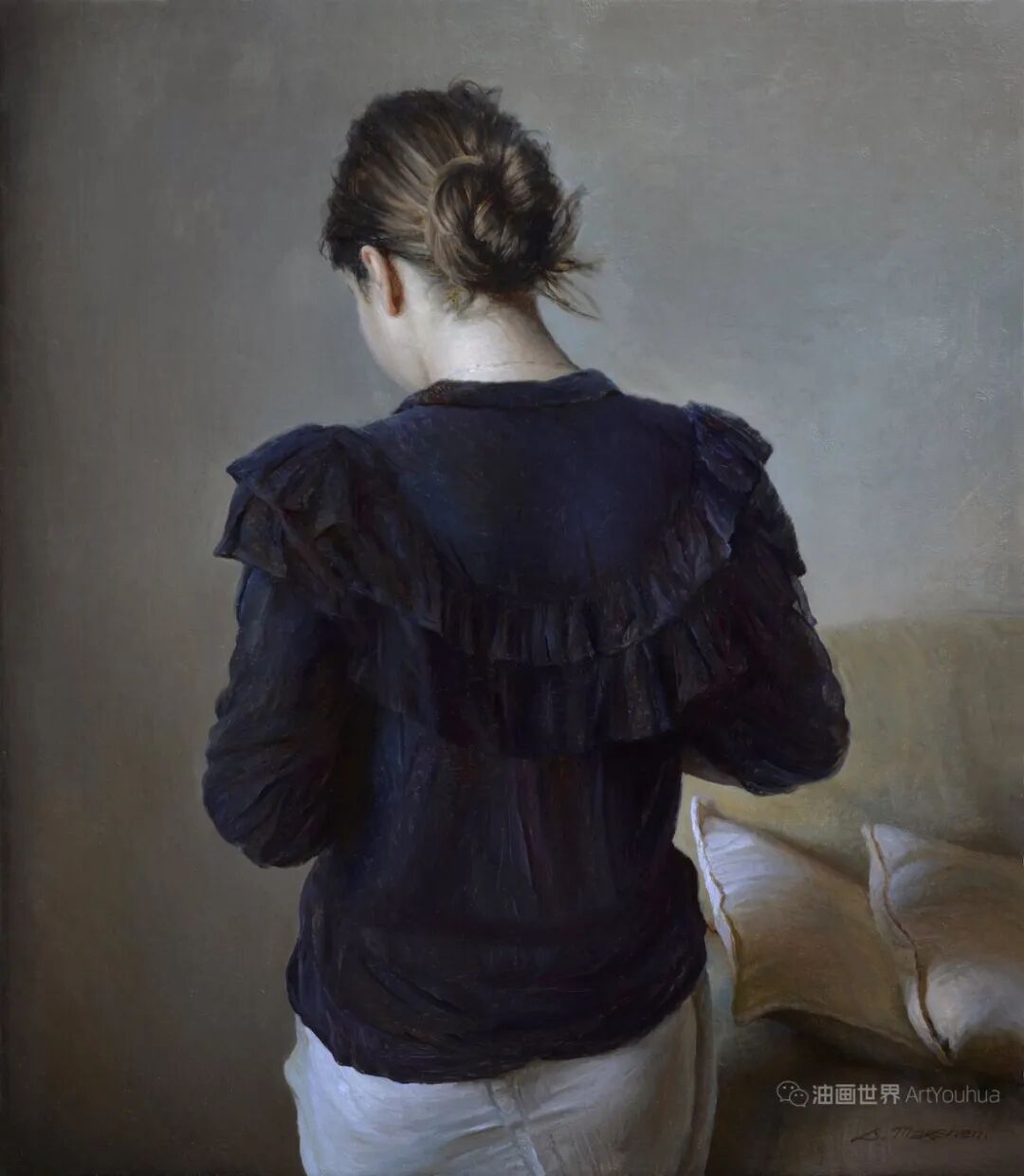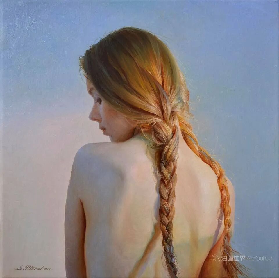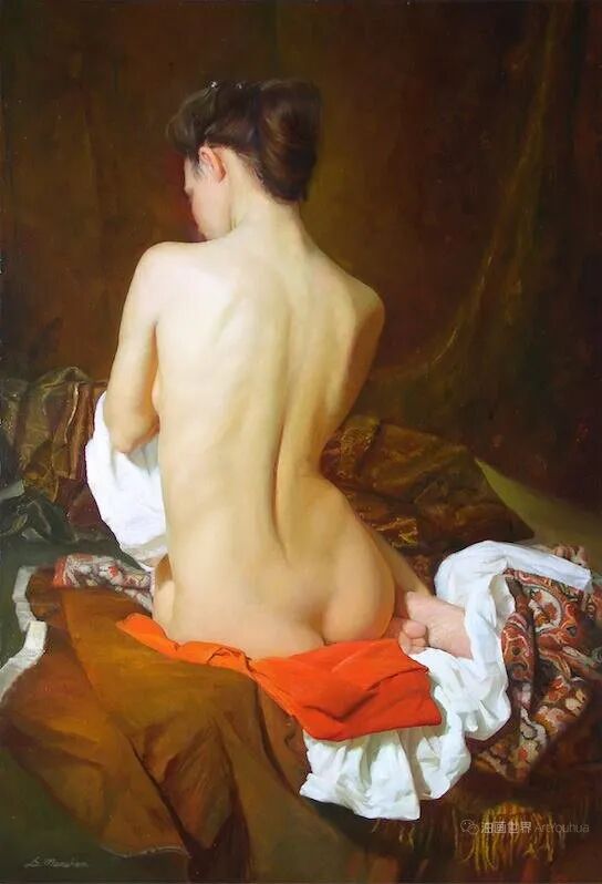 "我被Serge Marshennikov的诱人的女性油画肖像《海盗风格的床》所诱惑。马申尼科夫用他的模特的慵懒姿势、垂在她臀部的精致花边、以及奢华的床单、被子和温暖的枕头的深层褶皱来传达性感、女性的魅力和每天早上醒来时精致的艺术作品带来的无尽快乐的承诺。" ——托马斯·霍尔 (艺术评论家)