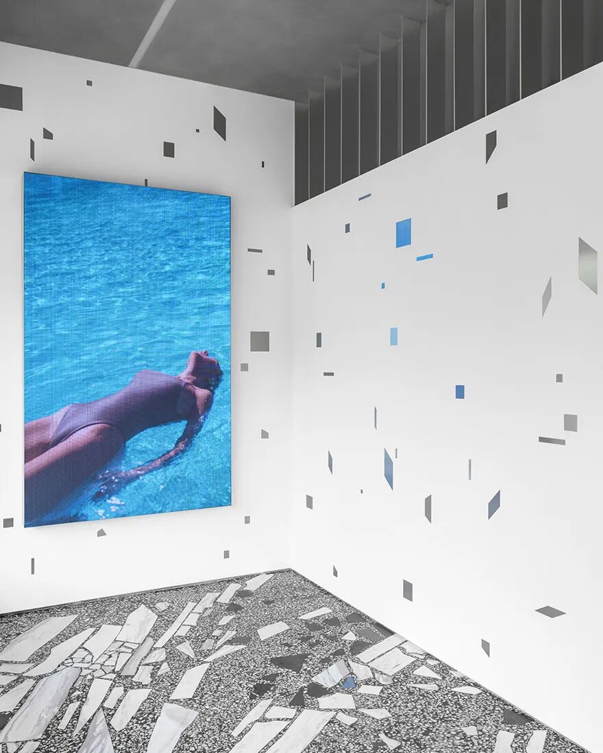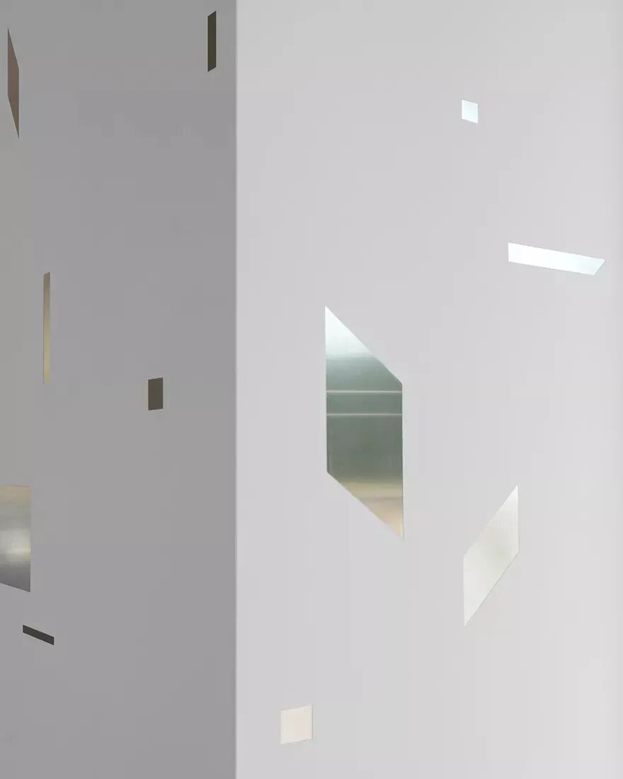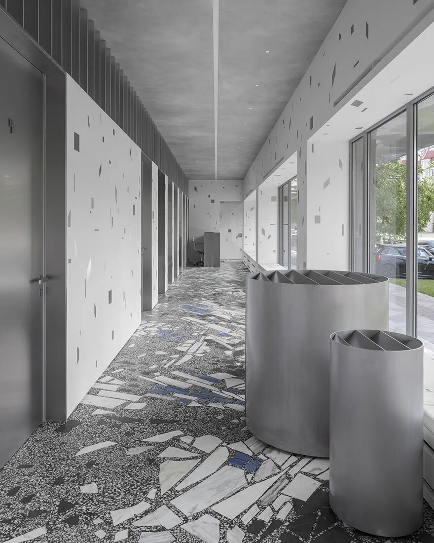 沙龙的墙壁被漆成白色,但上面的图形是由不锈钢制成。每一个金属碎片都反射着天空、树木的绿化、屏幕和过往车辆的光。几乎所有的家具都融入了空间的整体架构。在画廊里,架子、更衣室和所有电器都内置在墙上。等候区位于展示窗口沿线。