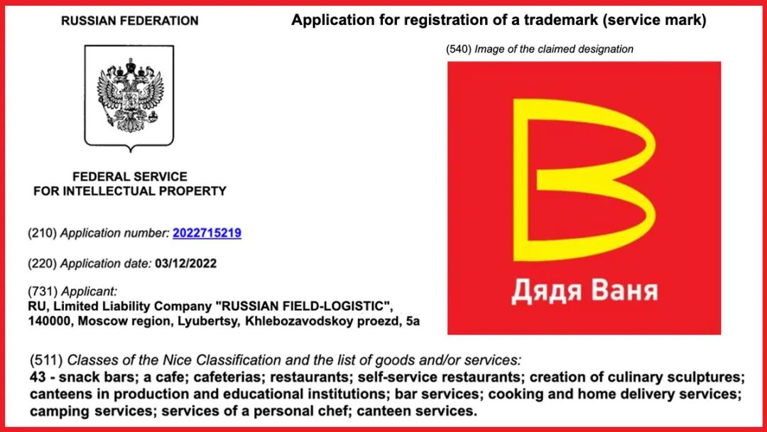 麦当劳将被当地的新快餐品牌“万尼亚舅舅”(Дядя Ваня、Uncle Vanya's)取代。万尼亚舅舅的新标志让人似曾相识,网民笑称“太会玩了吧,叔叔变舅舅”。