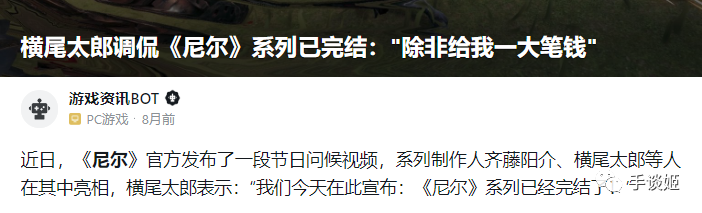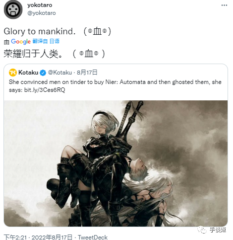 搞笑的是,kotaku的报道还被横尾太郎本人转发了,并评论说:“荣耀归于人类!”(这是游戏中的文本,化用了《圣经》的句子)