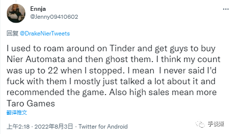 然后事件的主角就登场了,名叫Jen,她在这个推文底下留言说,在以前玩tinder的时候,安利过别人买《尼尔 自动人形》,然后就不再理他们了。