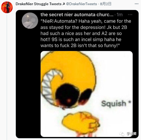 八月初,有《尼尔》的忠实玩家在推特贴了一些网友丑态,大意是说有些人觉得2B的屁股很漂亮,A2的身材很性感,9S是纯情小奶狗,想干XXX。看博主的意思应该是受不了这种言论,用国内流行词就是“真下头”吧。