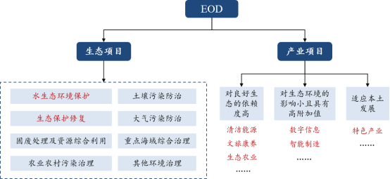 生态项目是基础。2022年生态环境部发布的《生态环保金融支持项目储备库入库指南》中明确了EOD项目的八大生态环境治理领域:水生态环境保护、生态保护修复、固废处理及资源综合利用、农业农村污染治理、土壤污染防治、大气污染防治、重点海域综合治理、其他环境治理。从已落地的EOD项目来看,水生态环境保护和生态保护修复的项目居多,也有不少数项目包含了多种生态治理内容,说明EOD项目有综合解决生态治理的诉求。