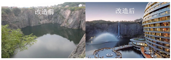 为了便于理解,先引入一个案例。上海天马山世茂深坑酒店位于上海松江国家风景区佘山脚下,改造前是一座深达80米的废弃大坑,改造后的“深坑酒店”和自然坑体完全相辅相成,酒店上下共18 层,其中地平面上2层,地平面以下16层,还有2层是在水下,充分利用了深坑特色。为深度体验深坑、悬崖峭壁的奇妙,项目建设方还设计了蹦极、攀岩、步行景观栈道以及深坑秘境主题乐园等配套游玩设施,酒店也因其鲜明的特色受到追捧,经营状况良好。