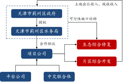 PPP模式是目前EOD项目唯一可通过政府付费收回投资的合法方式,最早以EOD模式开展的蓟运河项目便采用了PPP模式。该项目由天津市蓟州区政府授予水务局,引入投资建设主体(中交联合体),与政府指定平台成立项目公司,项目工期20年,中标金额约65亿元。项目的收益构成包括①政府付费:针对流域治理部分政府购买服务,中交联合体提供建设运营养护服务并结合绩效获得政府付费;②使用者付费:结合蓟州区自然资源及中交联合体企业资源,导入文化旅游、康养运动、智慧农业等项目,盘活经营性资产,中交联合体获得相关经营性收益;③政府方提供的额外收益,如中交联合体可按比例获得土地增值收益、综合治理专项补助资金等。