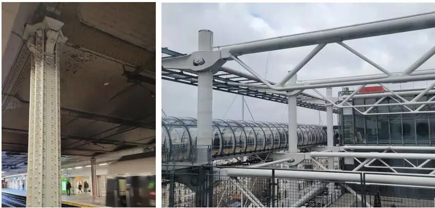 巴黎地铁里科林斯意味装饰的钢结构柱与蓬皮杜艺术中心外立面的钢结构节点。