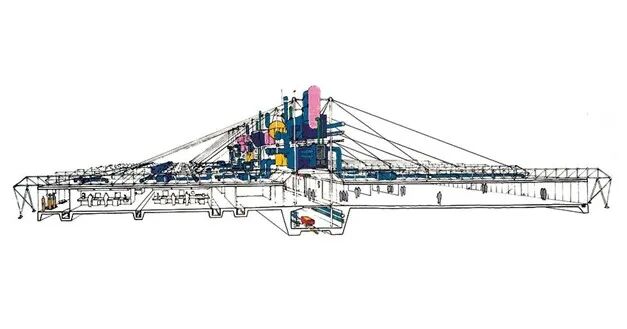 在实操上,建筑结构与其他机械技术帮助实现了这种根据活动调节功能的模式:14排两两相隔60英尺(约18米)的服务塔,内置了电梯机械等辅助设施,留出宽阔的中央开间,结构框架整体780英尺长、360英尺宽。绕轴旋转的电梯、移动模块的吊车和移动走廊可以适应不同的使用功能;它也可以根据气候条件调节建筑内部的物理环境,于是有了“静态蒸汽填充区(charged static-vapour zones)、光学屏障(optical barriers)、暖气风帘(warm-air curtains)和人工除雾(fog dispersal)”等机械装置。